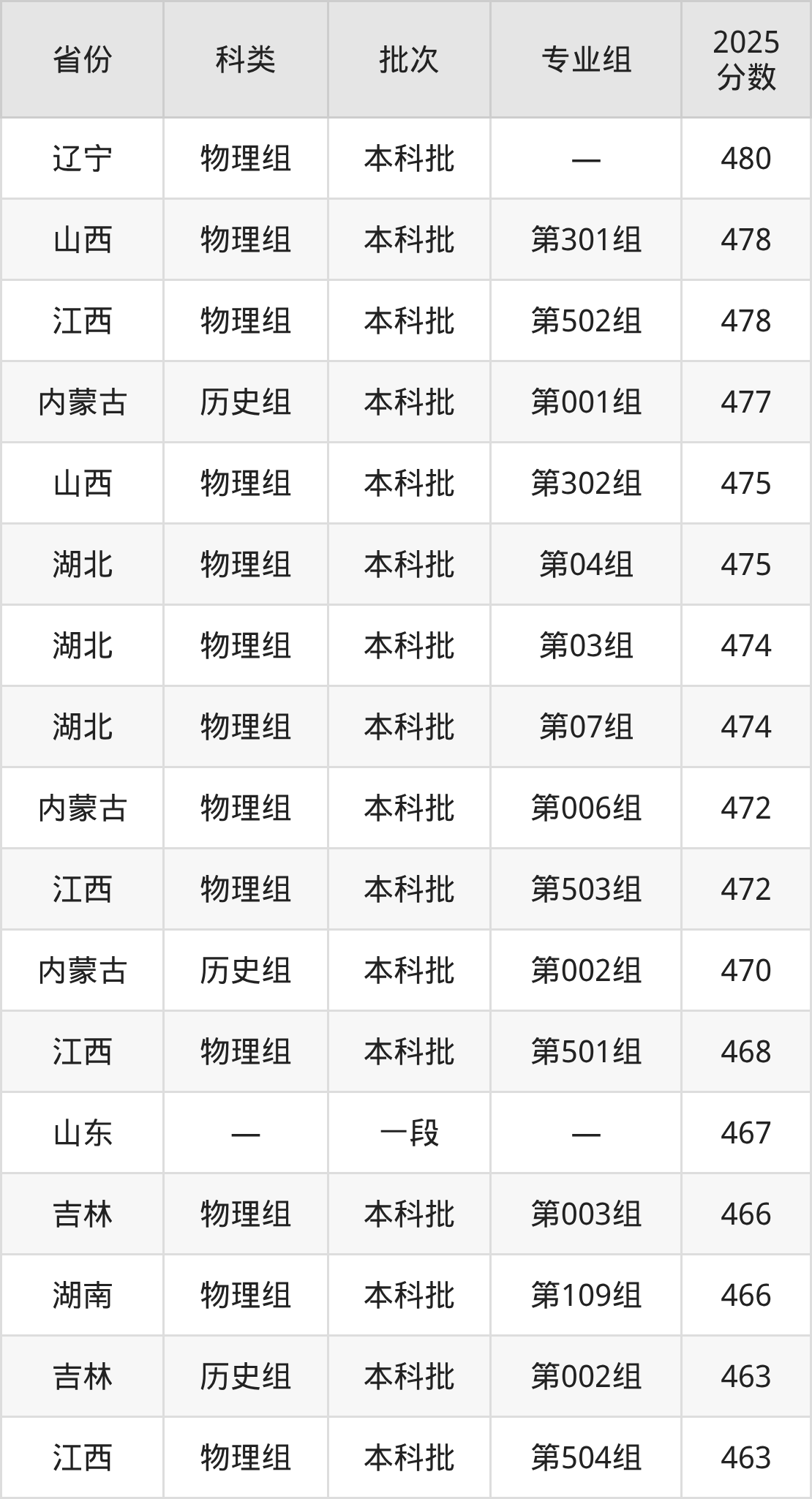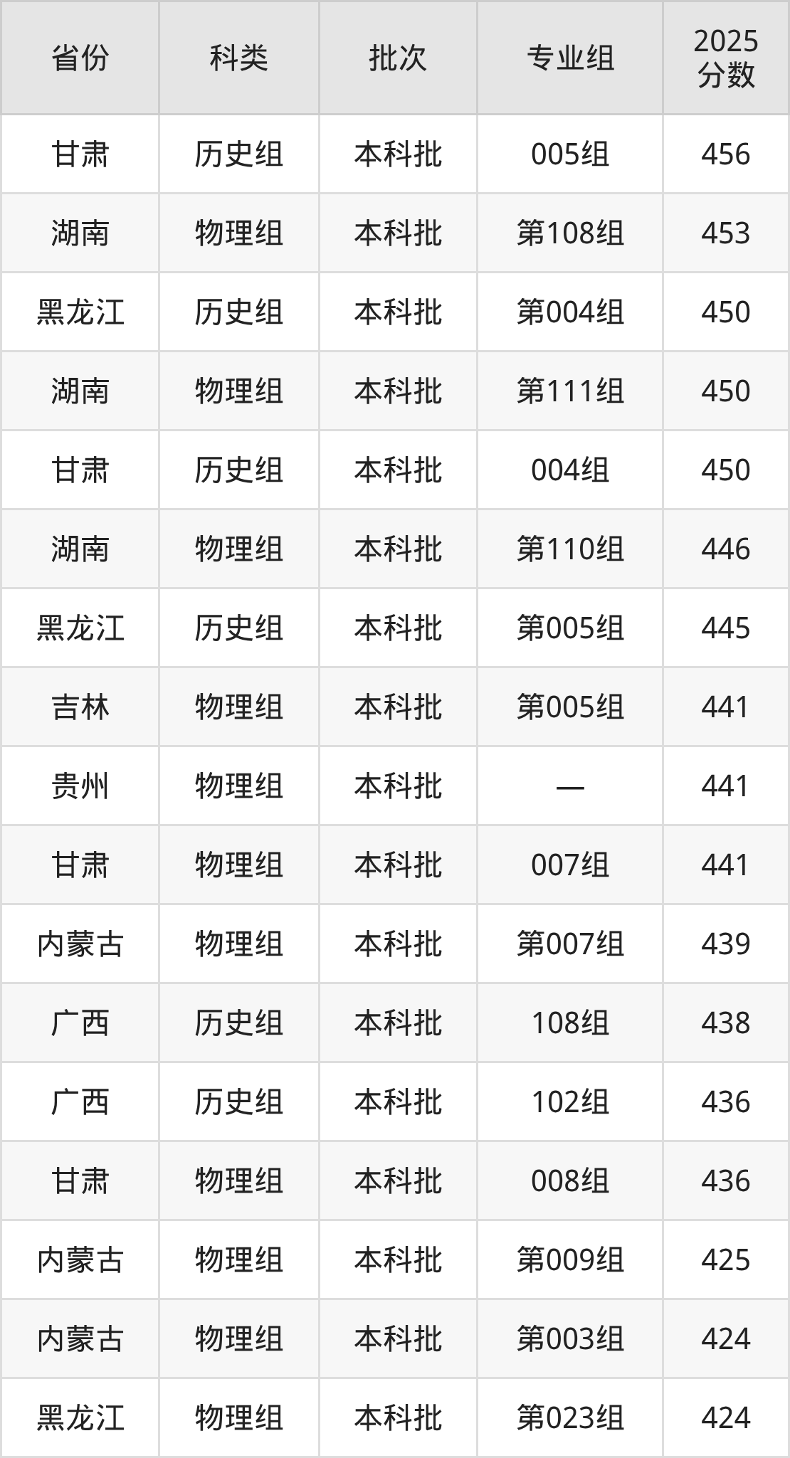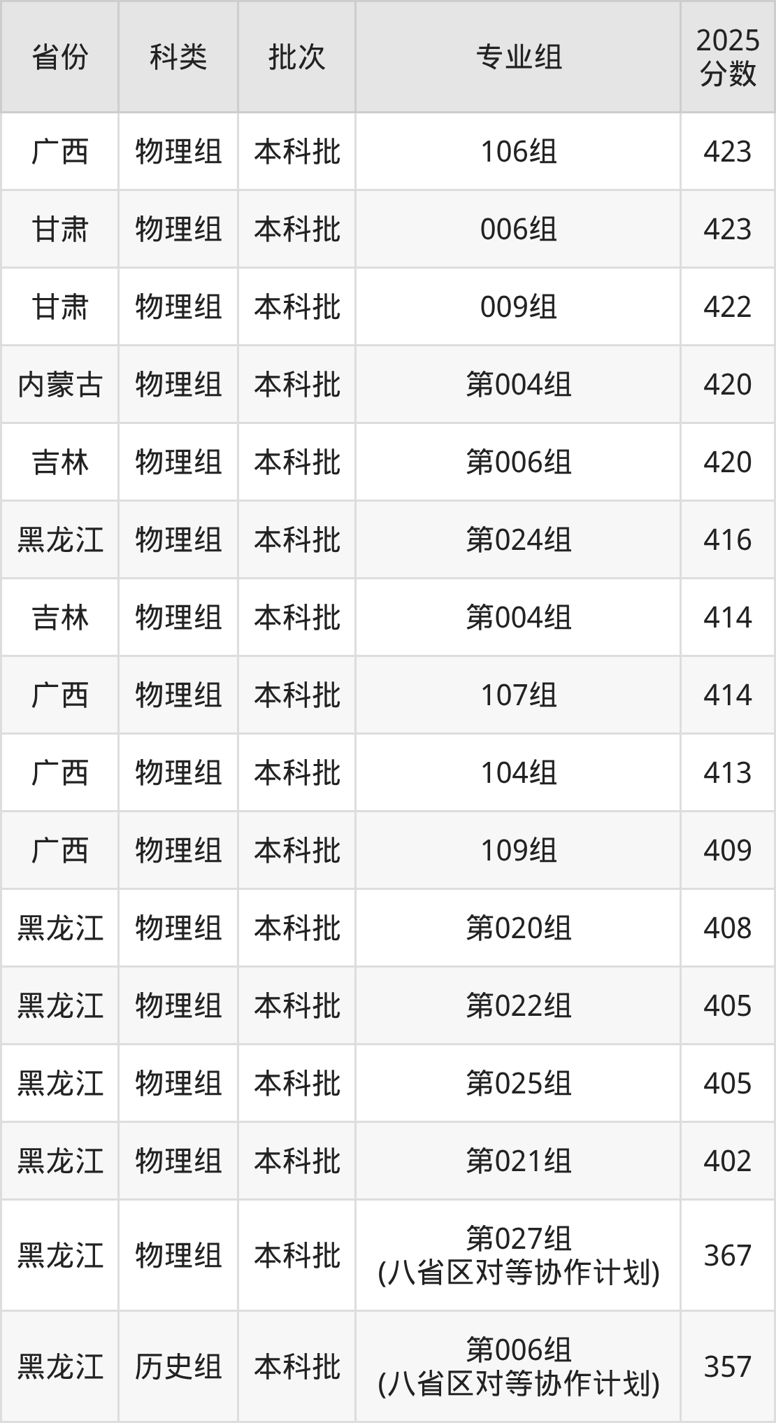2025年绥化学院在全国普通批次招生的录取分数范围位于357~544分之间,其中省内分数范围为357分~544分,物理组最低分专业组为“第027组(八省区对等协作计划)”,考生367分即可报考,历史组最低分专业组为“第006组(八省区对等协作计划)”,考生357分即可报考。