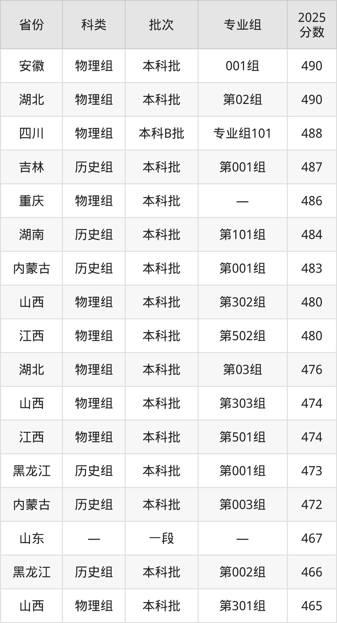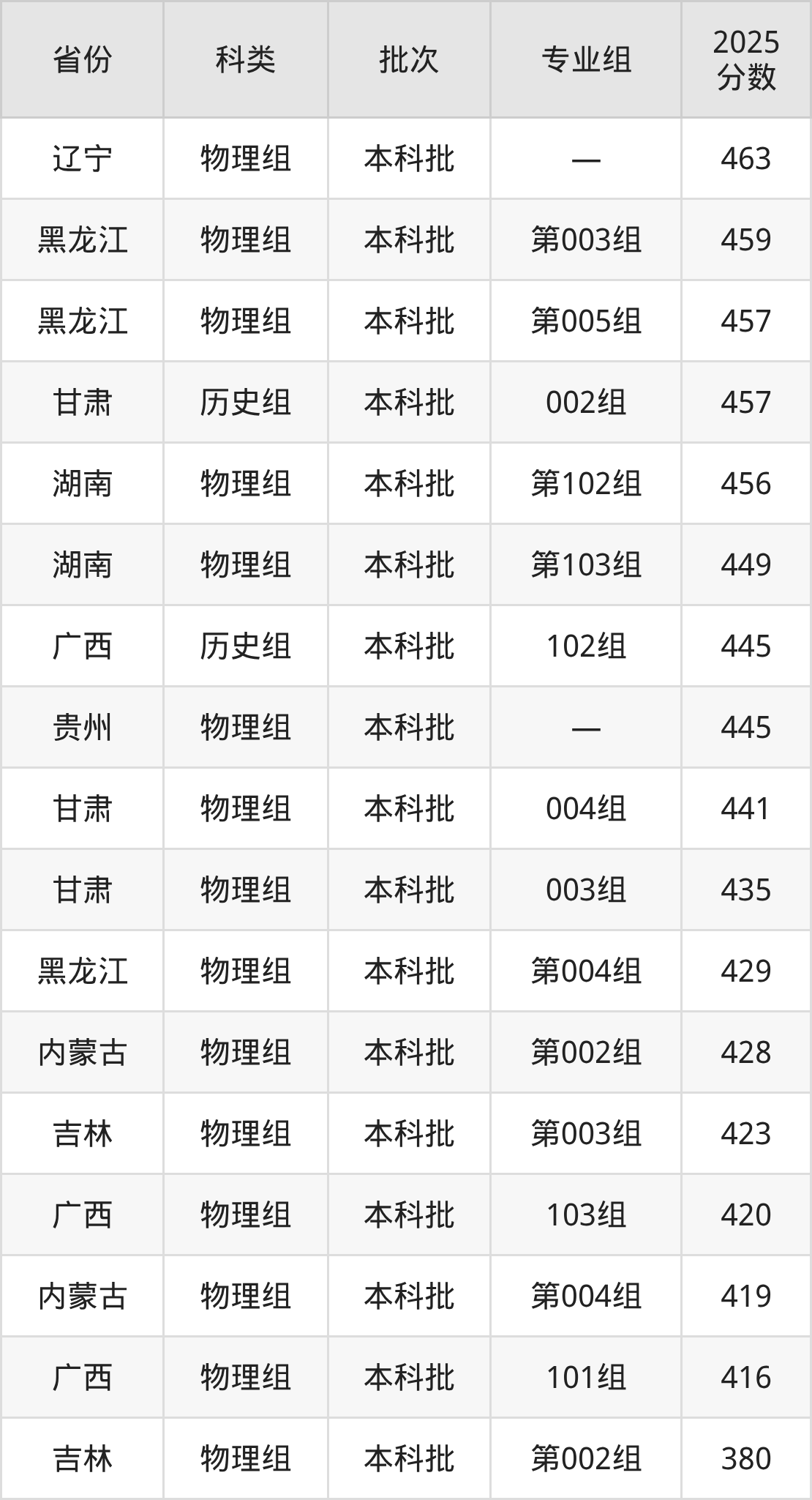 唐山师范学院在省外招生的最低分为380分,其中吉林地区物理组考生上唐山师范学院的分数门槛最低,考生成绩超本科线40分(380分)可上。其次是广西物理组考生,上唐山师范学院至少要超本科线46分(416分)。