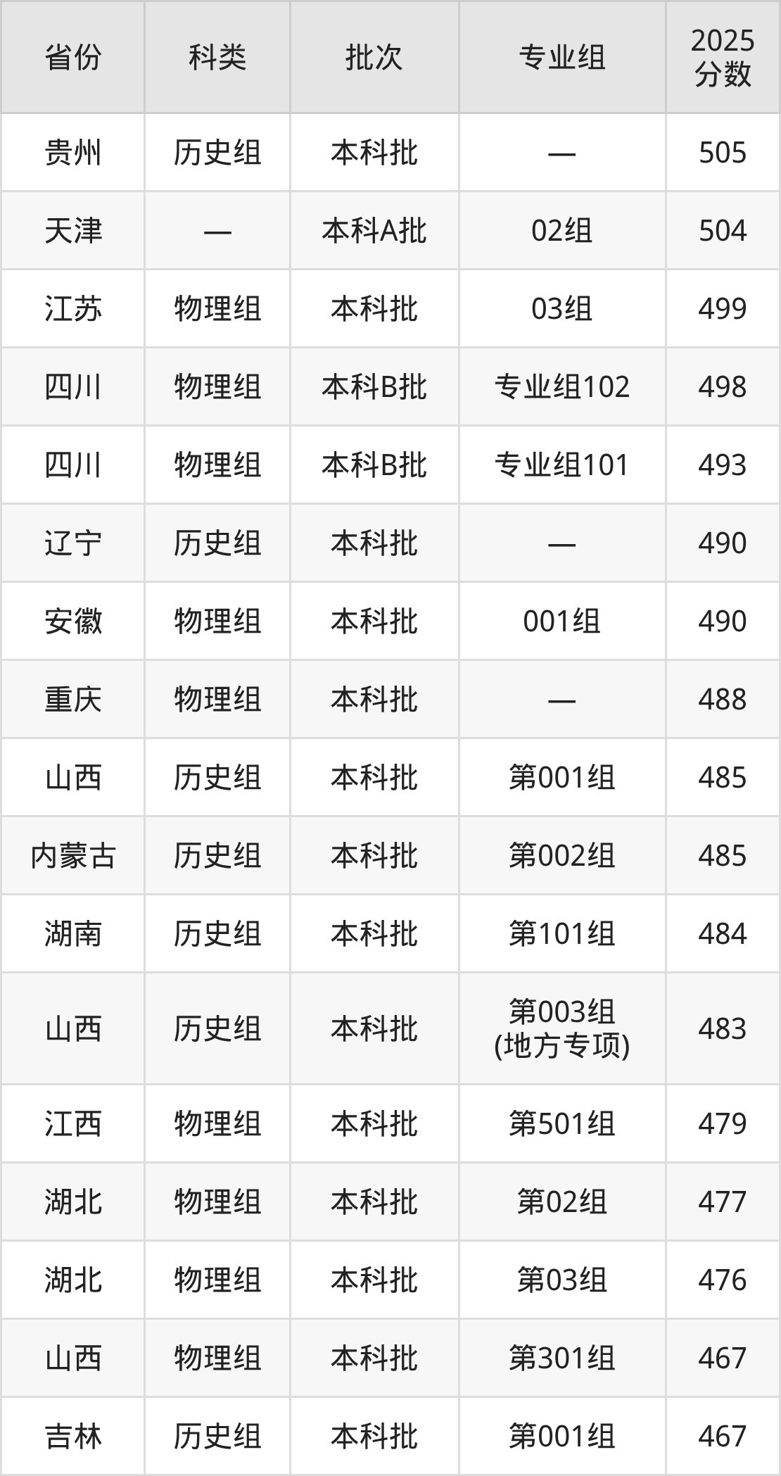 2025年晋中学院在全国普通批次招生的录取分数范围位于405~565分之间,其中省内分数范围为451分~514分,历史组最低分专业组为“第003组(地方专项)”,考生483分即可报考,物理组最低分专业组为“第303组(地方专项)”,考生451分即可报考。