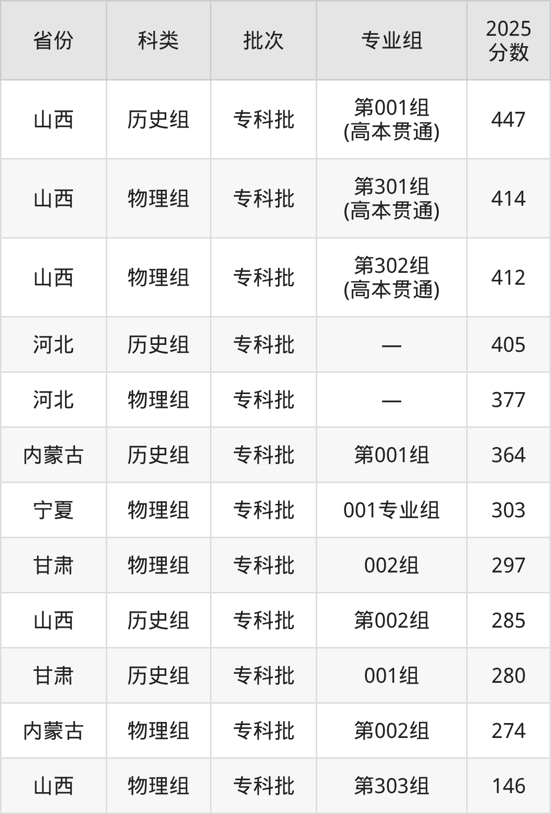 而河北地区历史组考生的分数门槛最高,2025年山西林业职业技术学院在河北招生最低分为405分,考生至少要超专科线205分才有可能被录取。