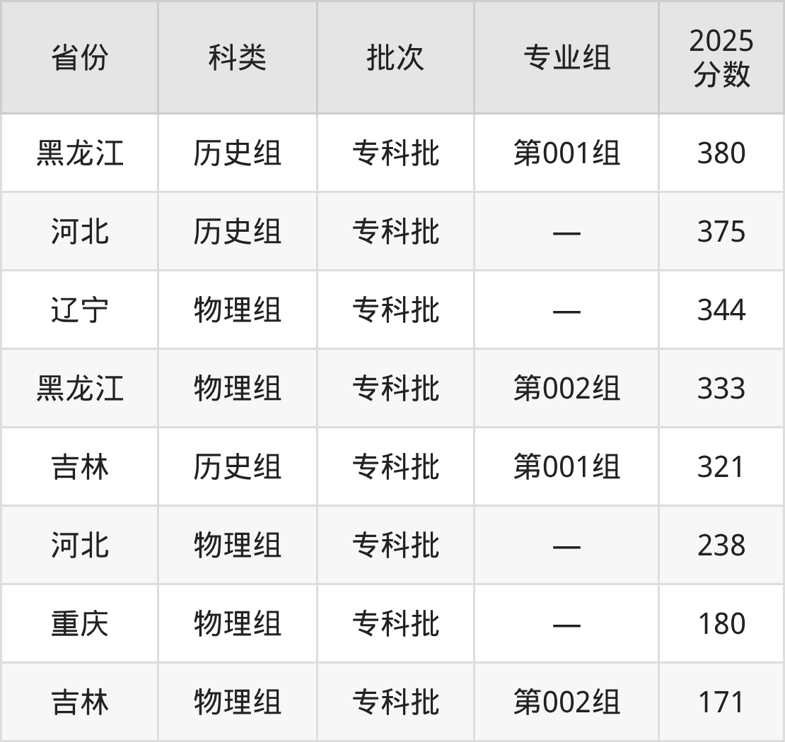 而黑龙江地区历史组考生的分数门槛最高,2025年梅河口康美职业技术学院第001组在黑龙江招生最低分为380分,考生至少要超专科线220分才有可能被录取。