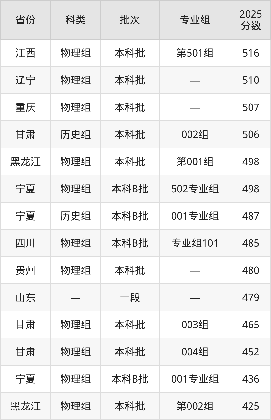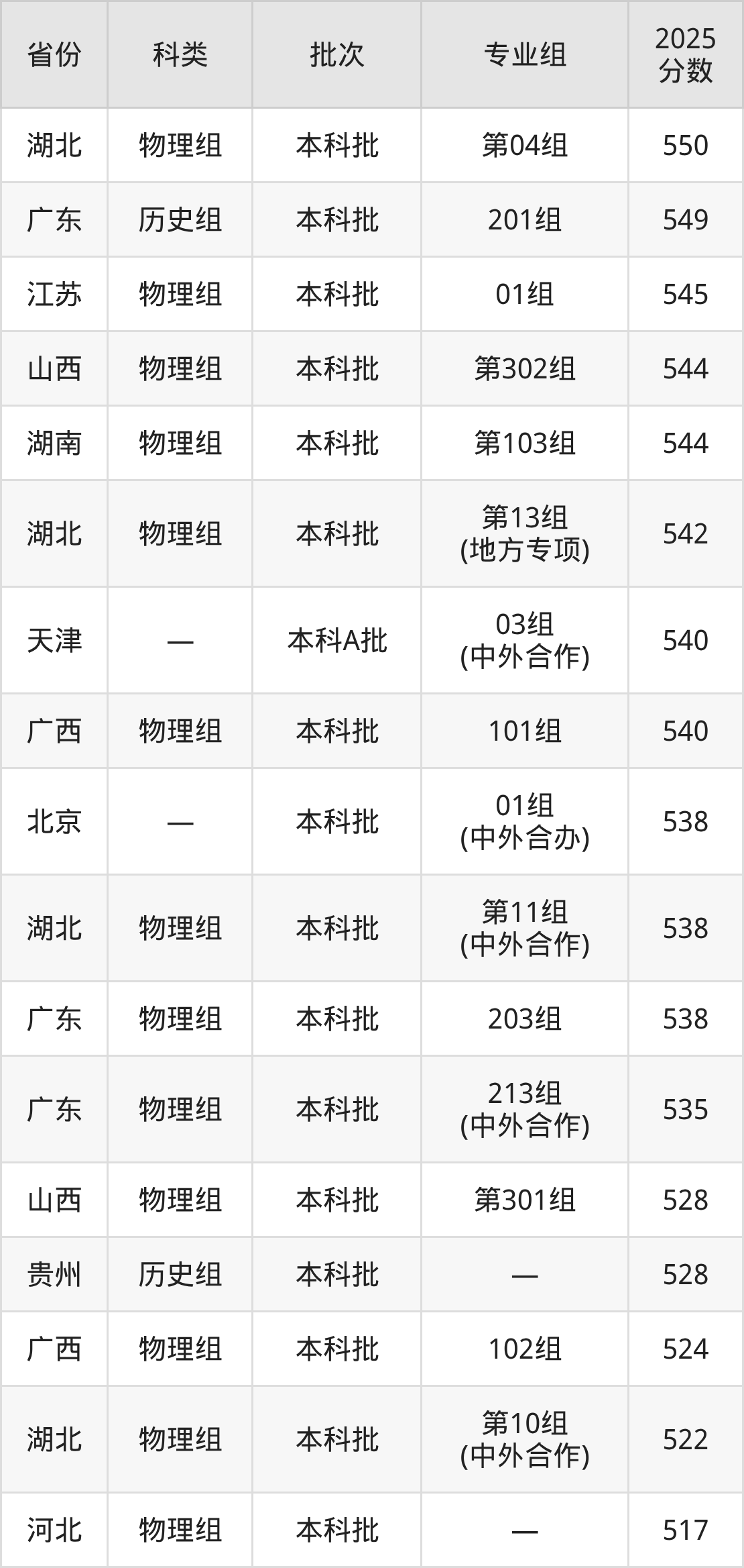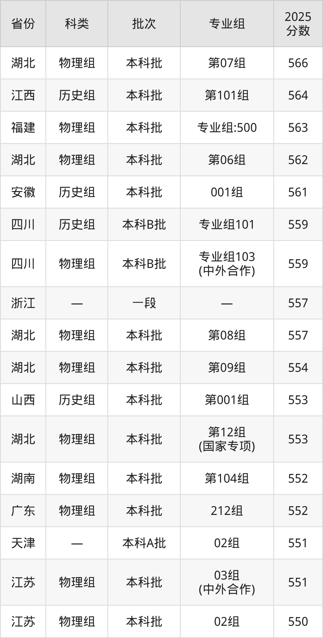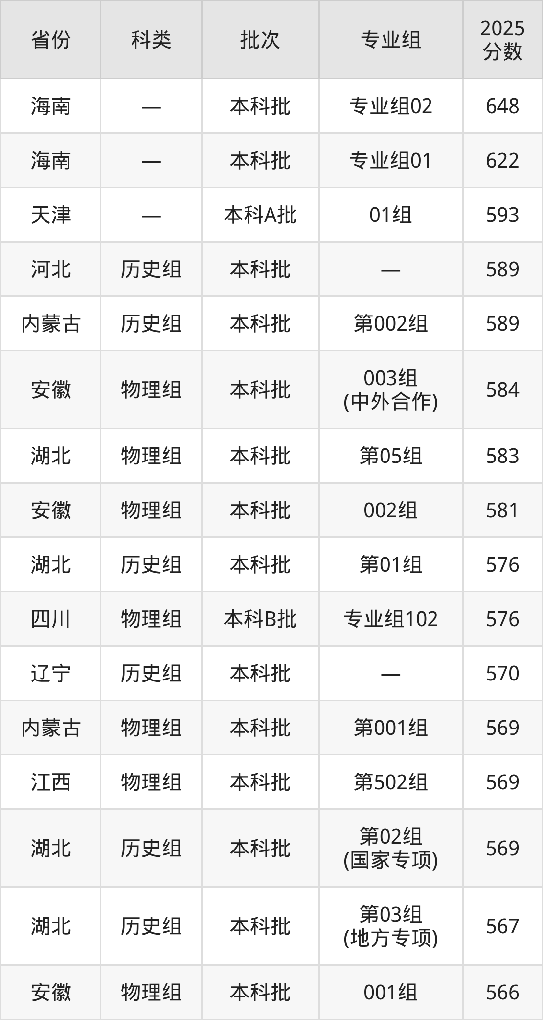2025年湖北工业大学在全国普通批次招生的录取分数范围位于425~648分之间,其中省内分数范围为522分~583分,物理组最低分专业组为“第10组(中外合作)”,考生522分即可报考,历史组最低分专业组为“第03组(地方专项)”,考生567分即可报考。