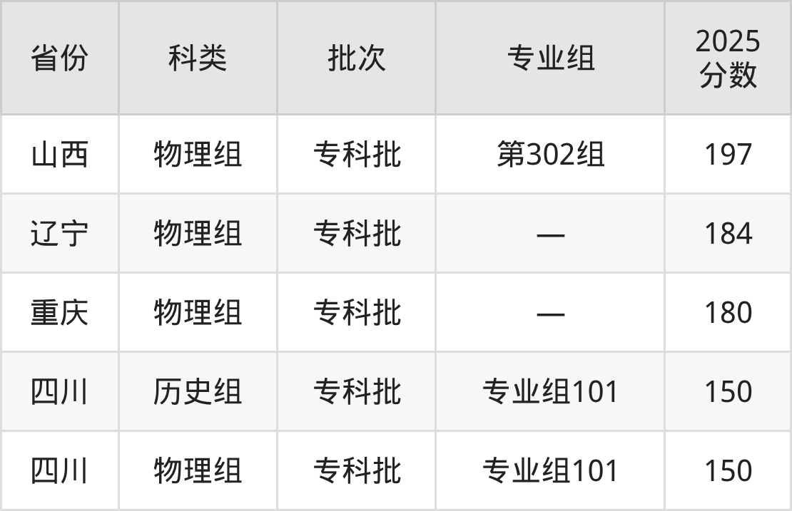 大连航运职业技术学院在省外招生的最低分为150分,其中四川地区历史组考生上大连航运职业技术学院的分数门槛最低,考生成绩达专科线即可报考。其次是重庆物理组考生,上大连航运职业技术学院至少要超专科线0分(180分)。