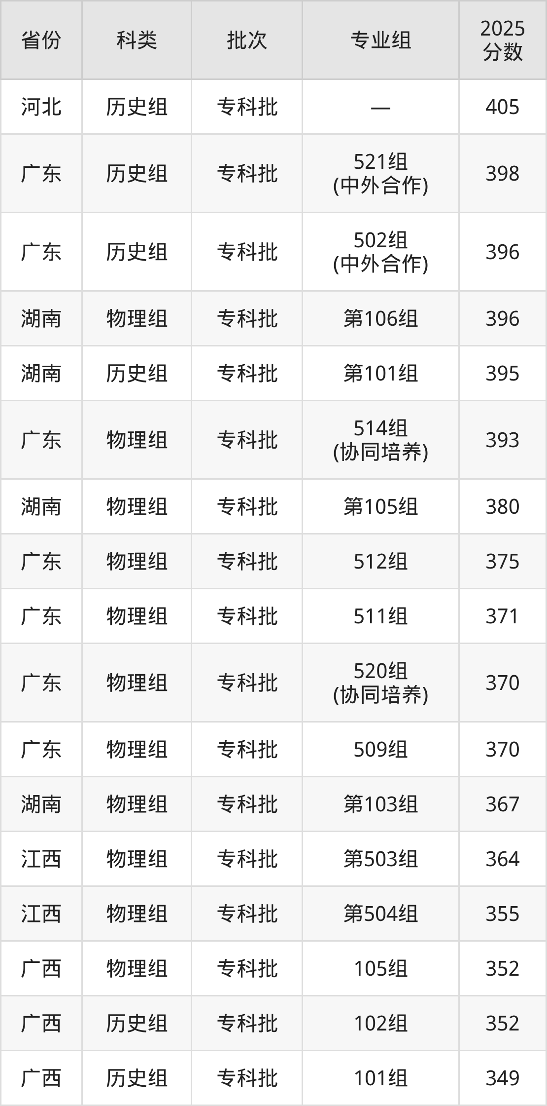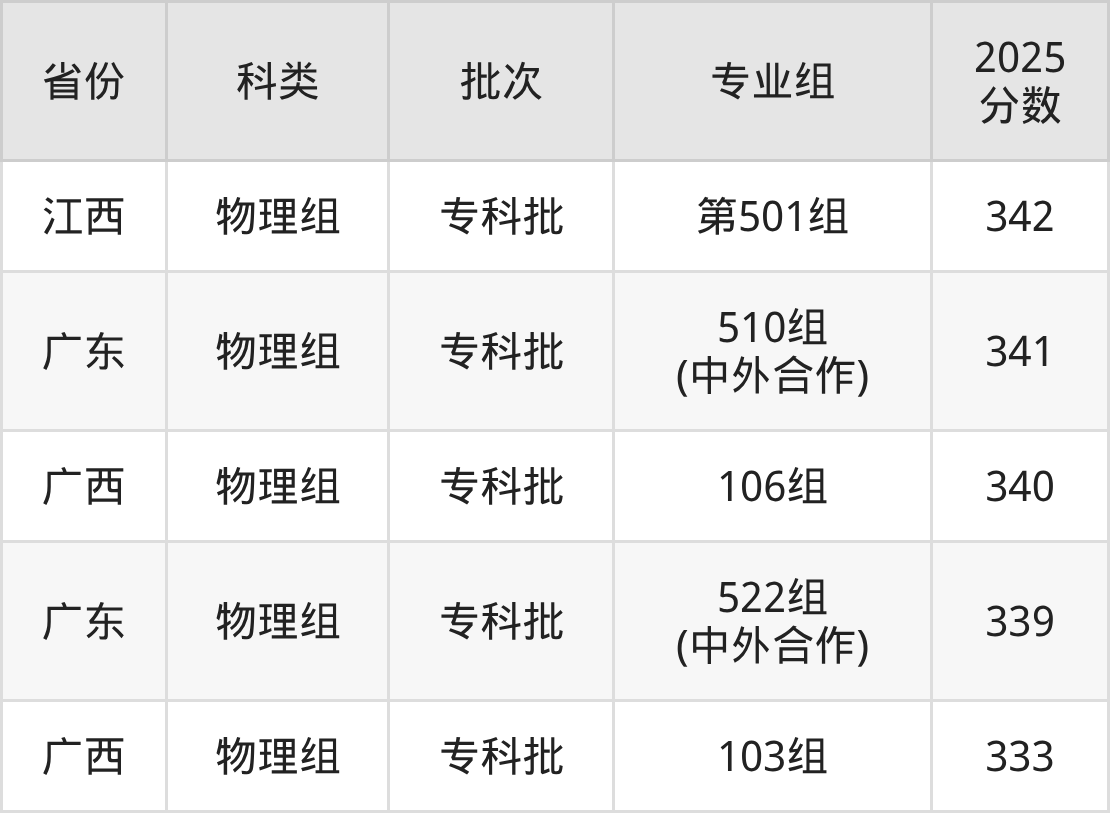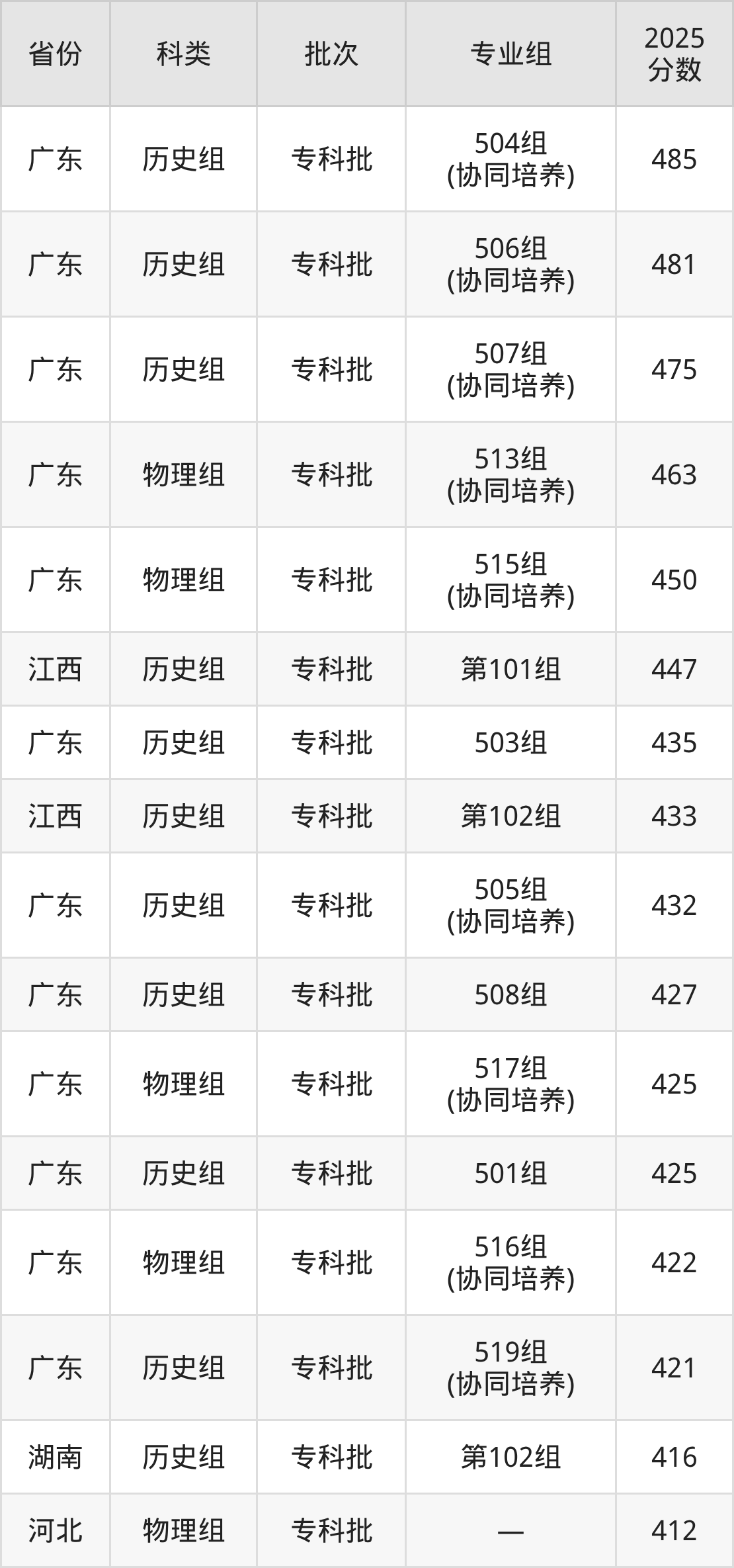 而江西地区历史组考生的分数门槛最高,2025年广东女子职业技术学院第101组在江西招生最低分为447分,考生至少要超专科线157分才有可能被录取。