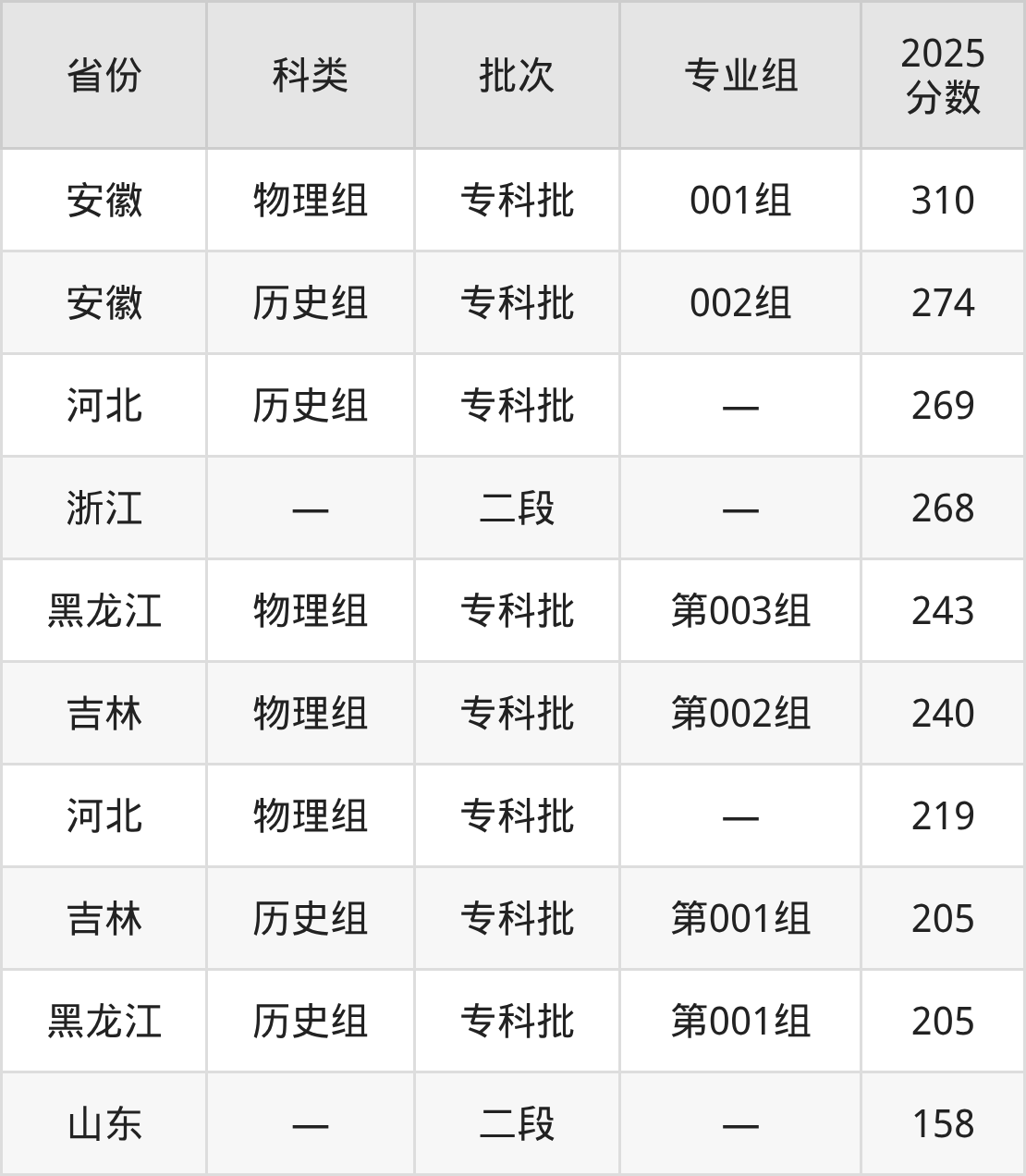 而安徽地区物理组考生的分数门槛最高,2025年潍坊食品科技职业学院001组在安徽招生最低分为310分,考生至少要超专科线110分才有可能被录取。