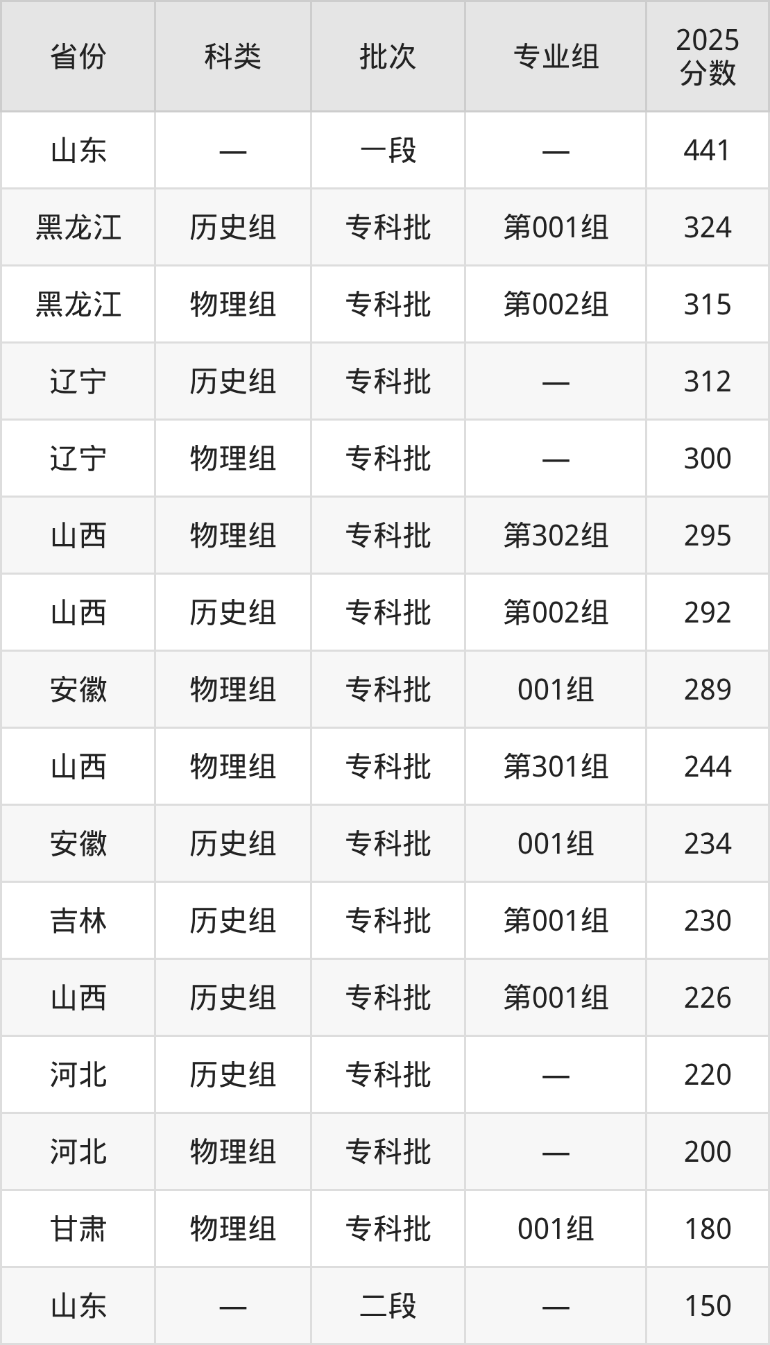 而黑龙江地区历史组考生的分数门槛最高,2025年山东外事职业大学第001组在黑龙江招生最低分为324分,考生至少要超专科线164分才有可能被录取。