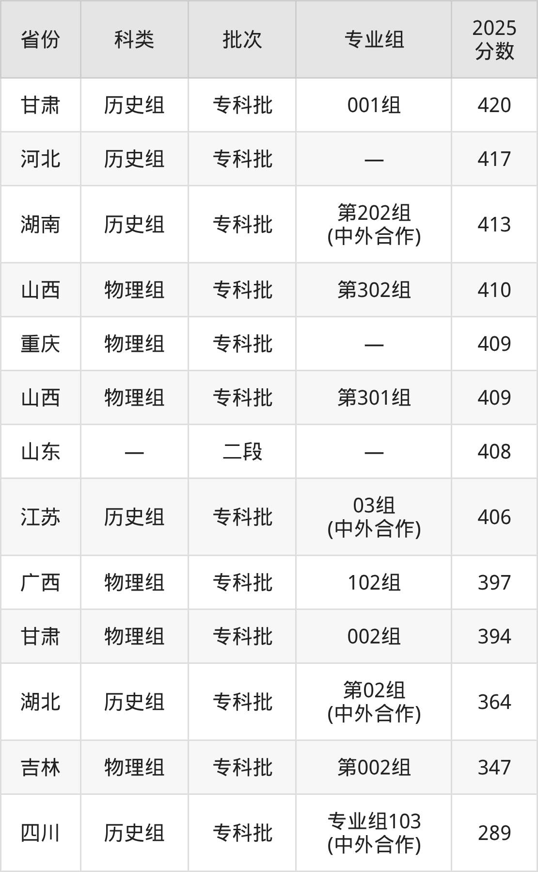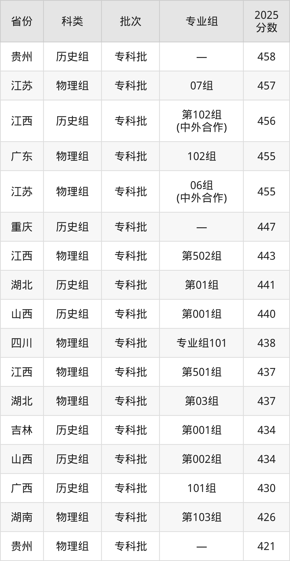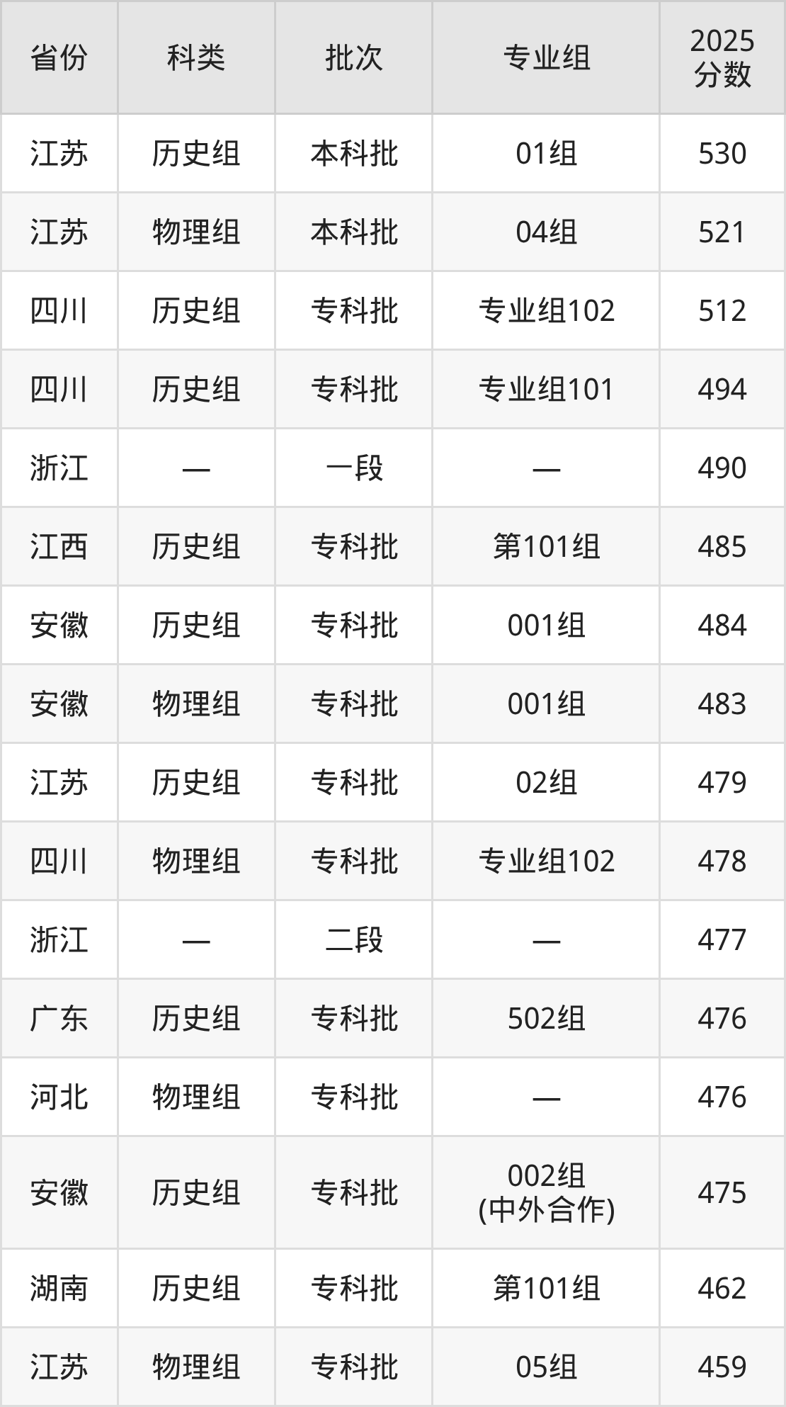 下面是苏州职业技术大学2025年在全国各省的录取分数线一览表,供参考: