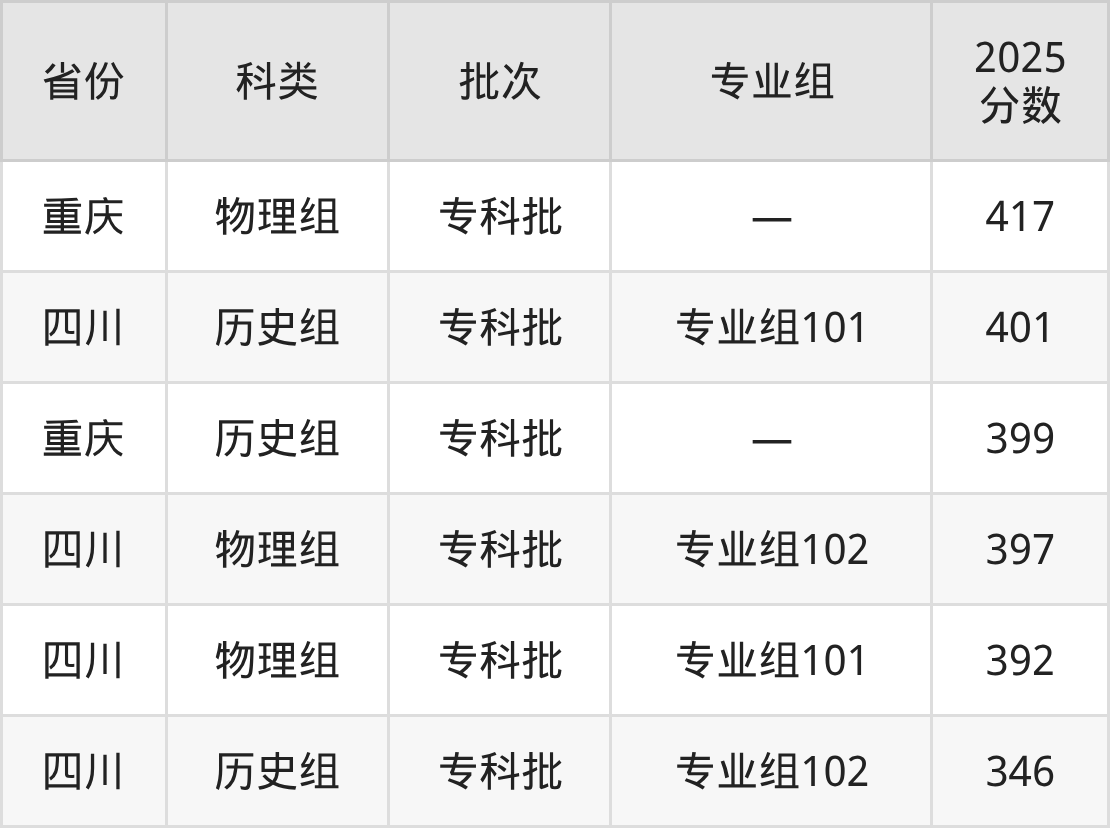 2025年四川机电职业技术学院在全国普通批次招生的录取分数范围位于346~417分之间,其中省内分数范围为346分~401分,物理组最低分专业组为“专业组101”,考生392分即可报考,历史组最低分专业组为“专业组102”,考生346分即可报考。