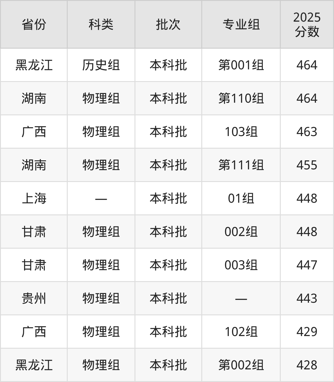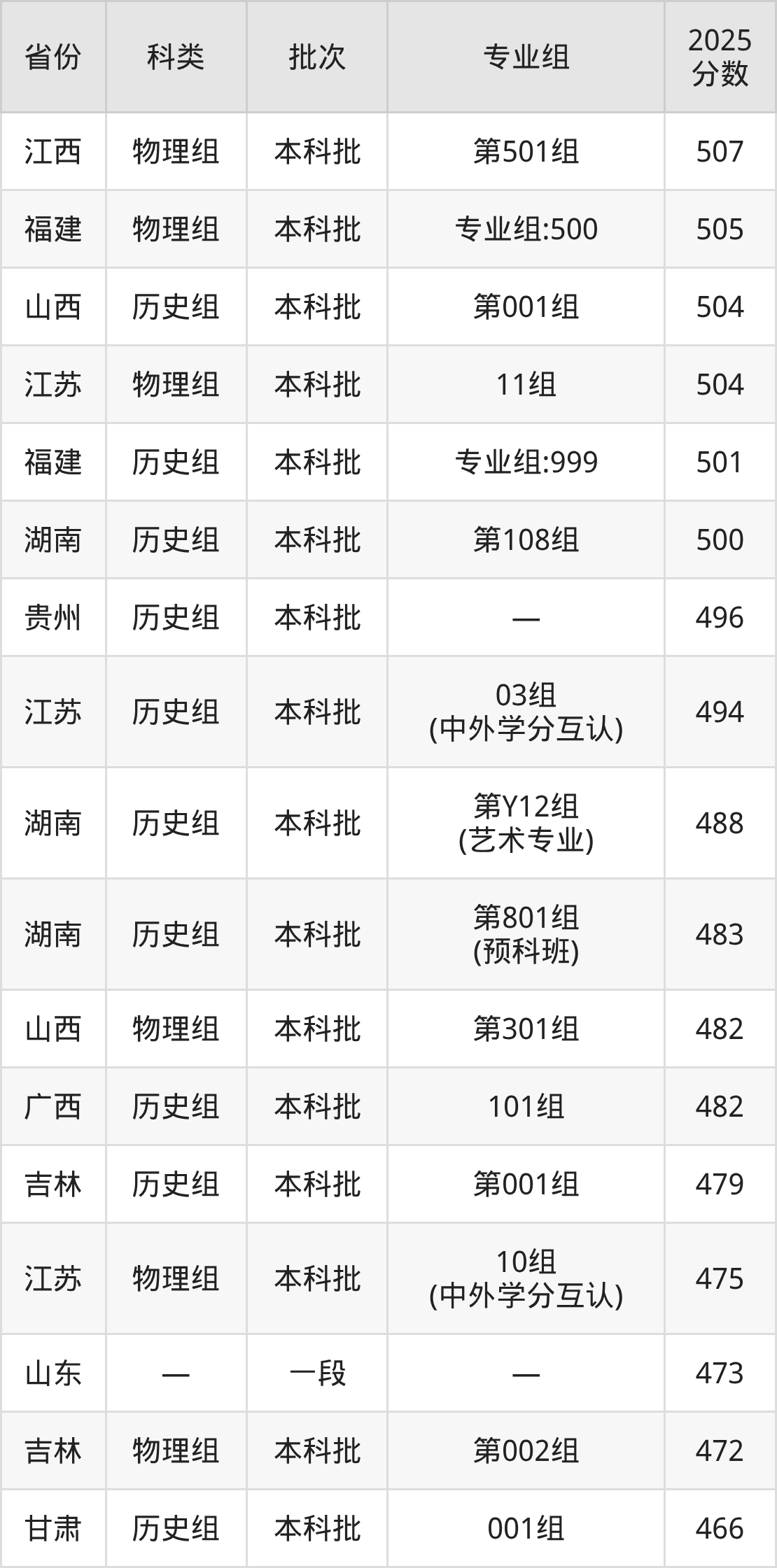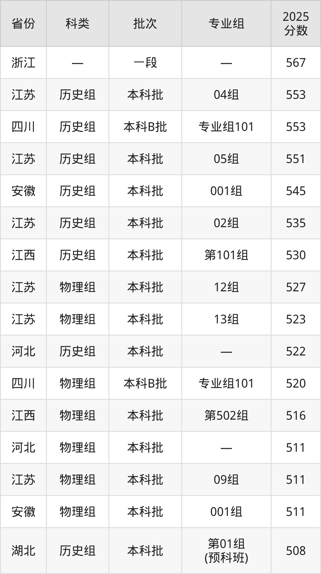 2025年淮阴师范学院在全国普通批次招生的录取分数范围位于428~567分之间,其中省内分数范围为475分~553分,历史组最低分专业组为“03组(中外学分互认)”,考生494分即可报考,物理组最低分专业组为“10组(中外学分互认)”,考生475分即可报考。