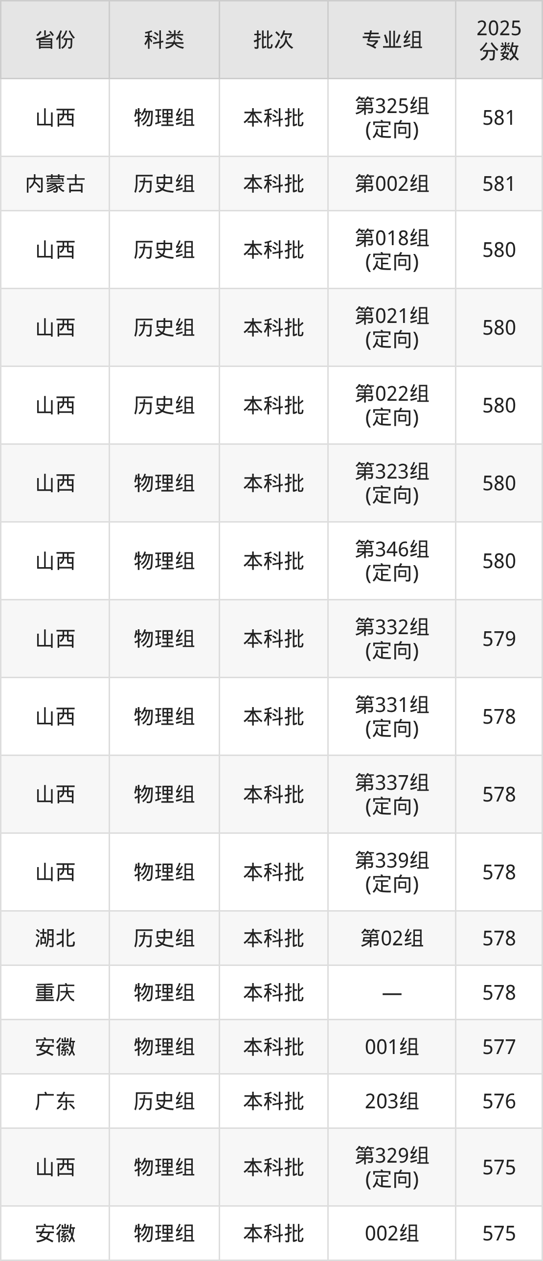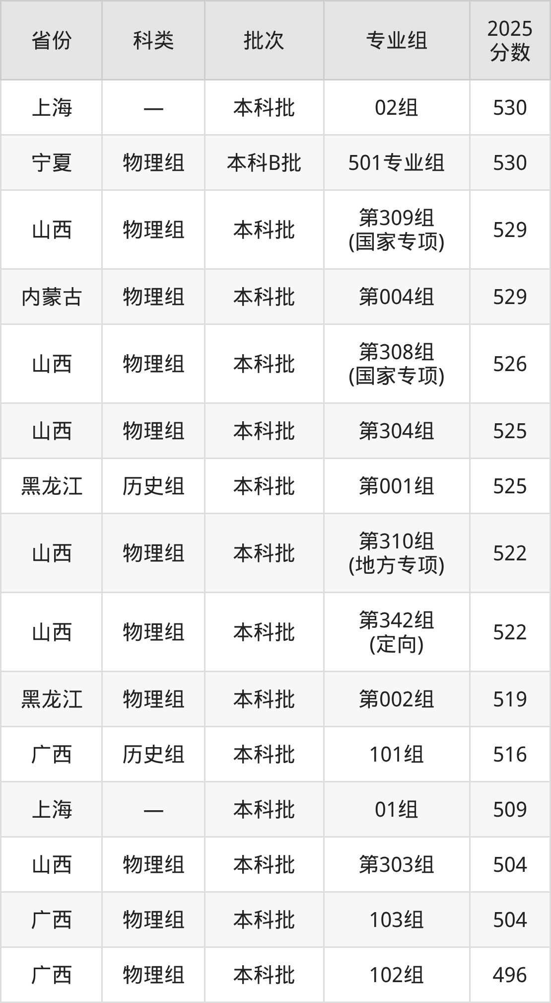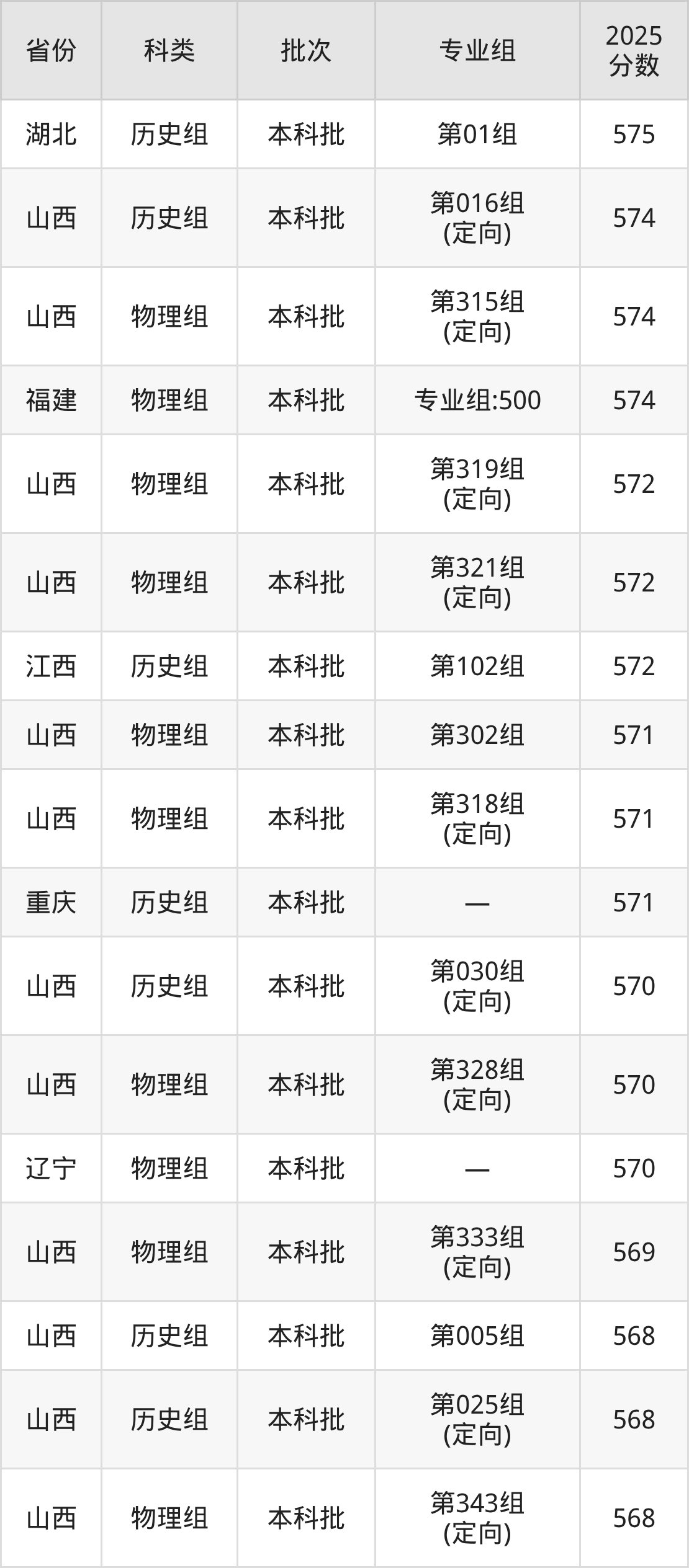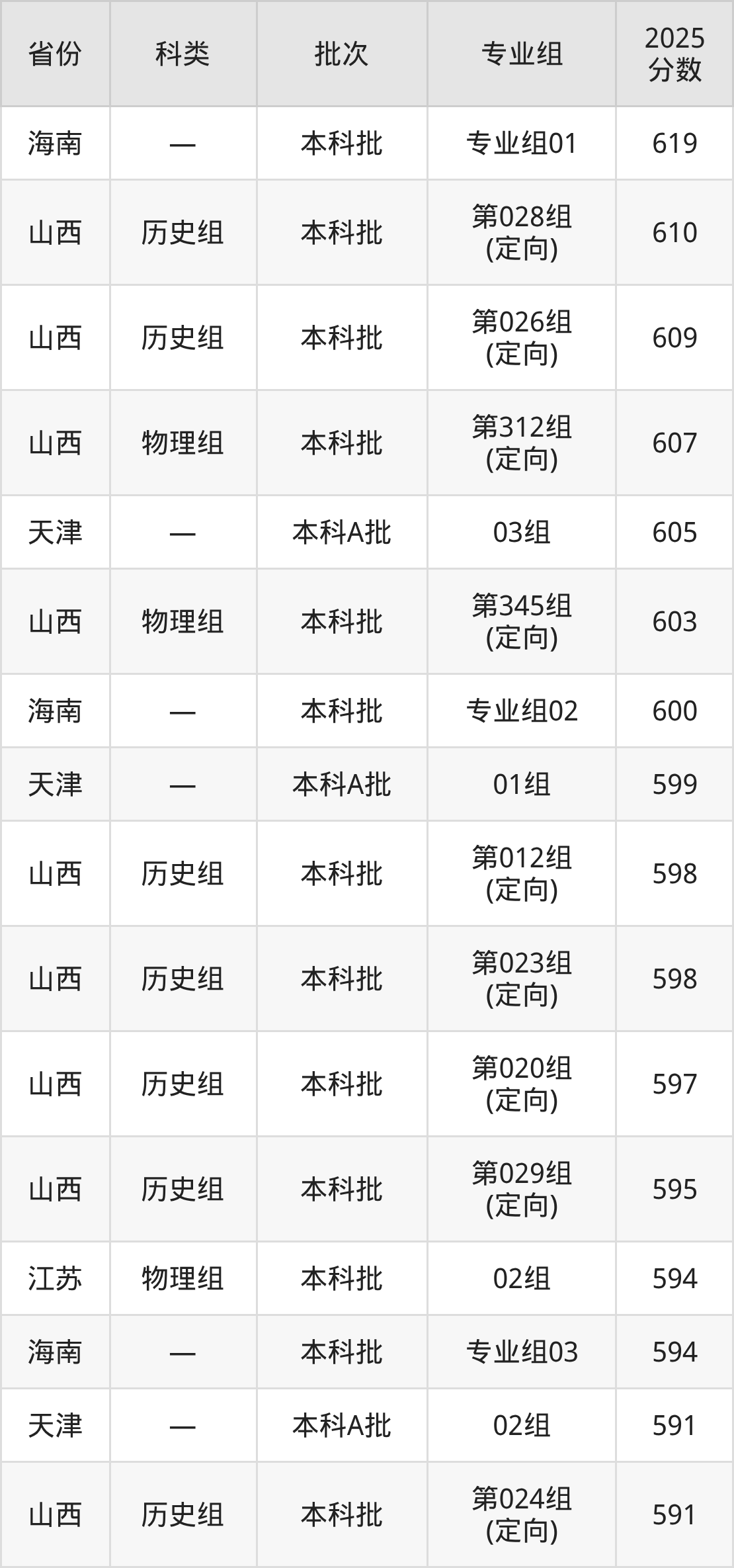 2025年山西大学在全国普通批次招生的录取分数范围位于496~619分之间,其中省内分数范围为504分~610分,历史组最低分专业组为“第014组(定向)”,考生535分即可报考,物理组最低分专业组为“第303组”,考生504分即可报考。