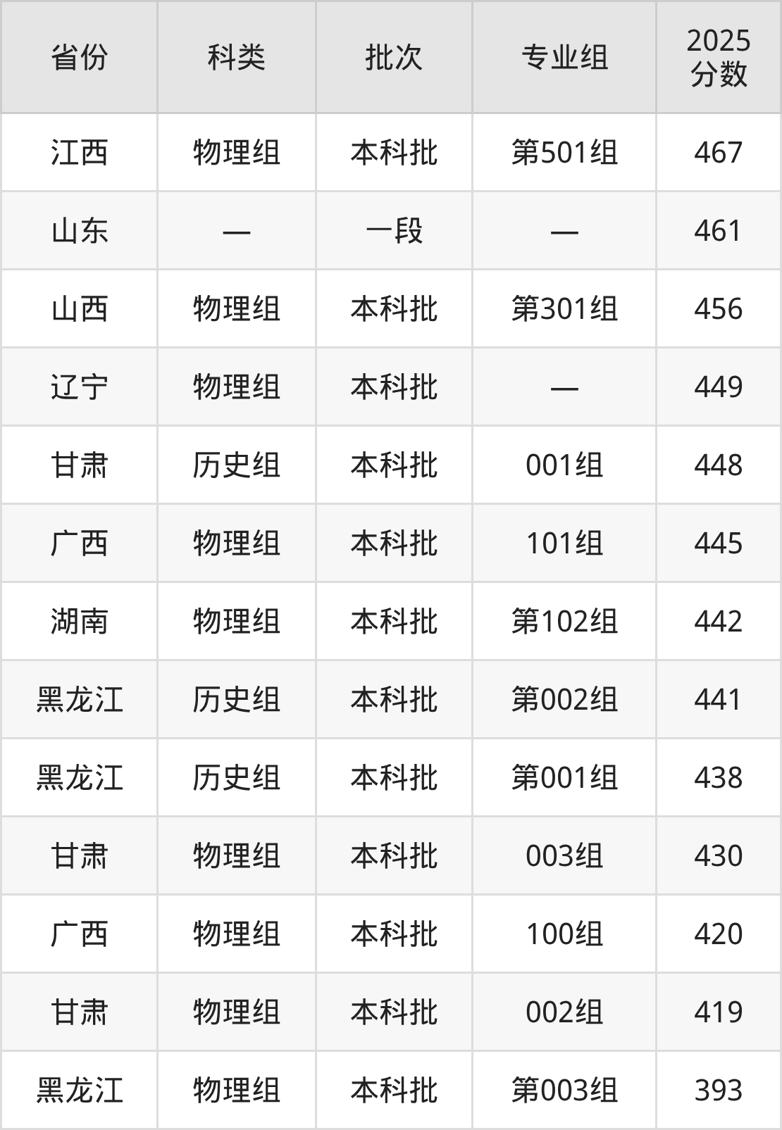 西藏农牧大学在自治区外招生最低录取分数线为393分,不同地区、不同科类的考生最低分有差异。