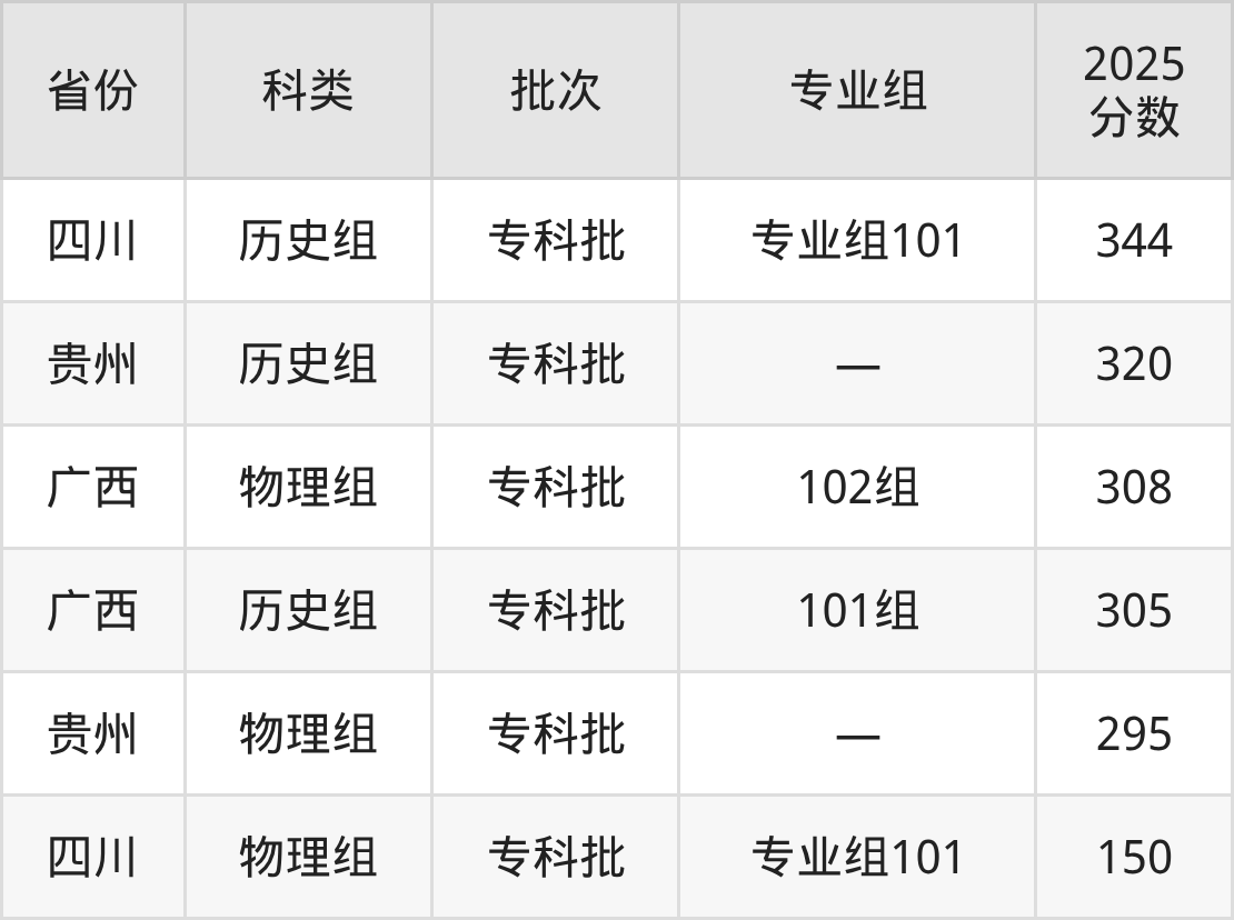 广西现代职业技术学院在壮族自治区外招生的最低分为150分,其中四川地区物理组考生上广西现代职业技术学院的分数门槛最低,考生成绩达专科线即可报考。