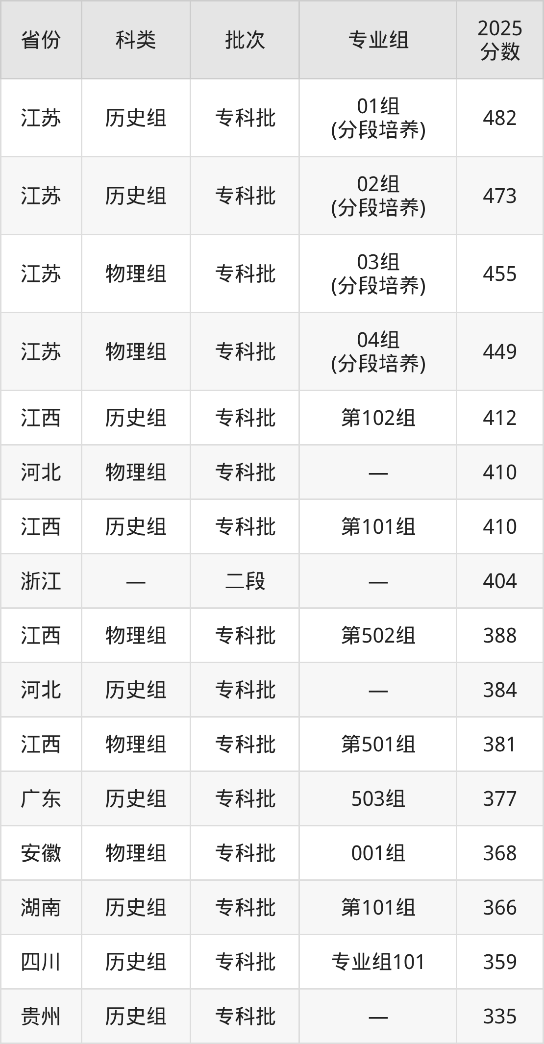而江西地区历史组考生的分数门槛最高,2025年太湖创意职业技术学院第102组在江西招生最低分为412分,考生至少要超专科线122分才有可能被录取。