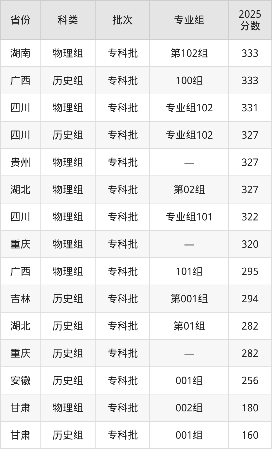 下面是太湖创意职业技术学院2025年在全国各省的录取分数线一览表,供参考: