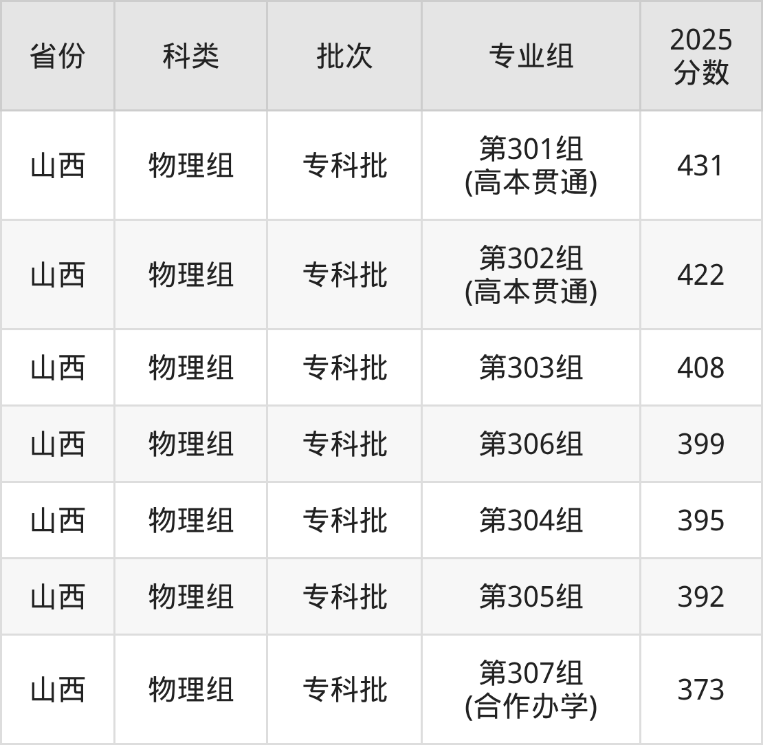 2025年山西电力职业技术学院在全国普通批次招生的录取分数范围位于373~431分之间,其中省内分数范围为373分~431分,物理组最低分专业组为“第307组(合作办学)”,考生373分即可报考。