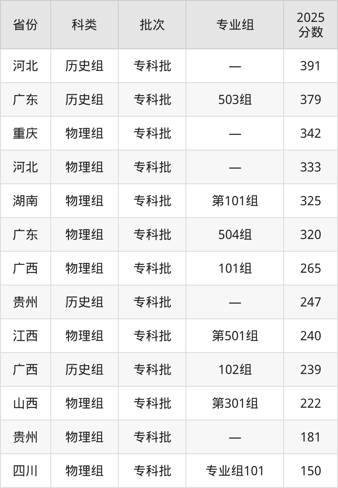 下面是黔东南理工职业学院2025年在全国各省的录取分数线一览表,供参考: