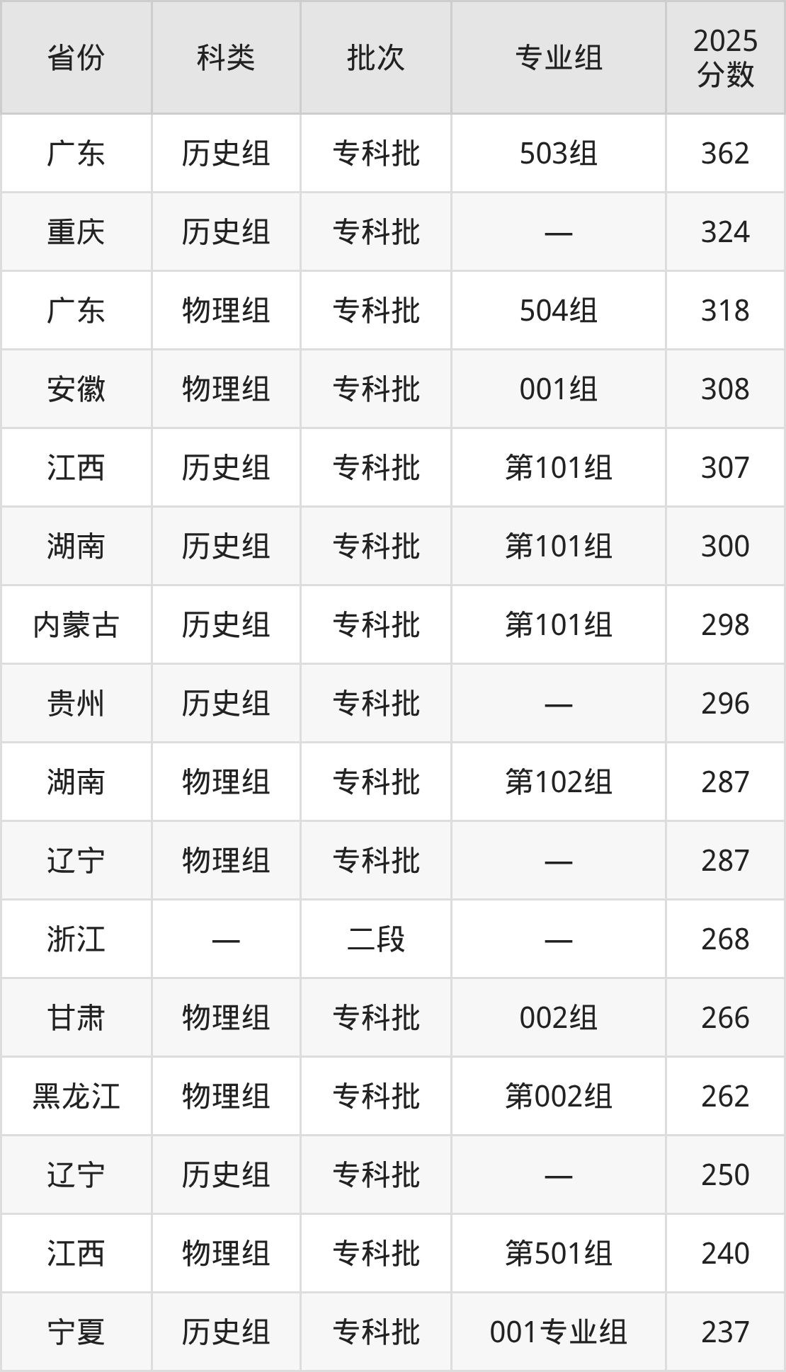 而广东地区历史组考生的分数门槛最高,2025年资阳环境科技职业学院503组在广东招生最低分为362分,考生至少要超专科线147分才有可能被录取。