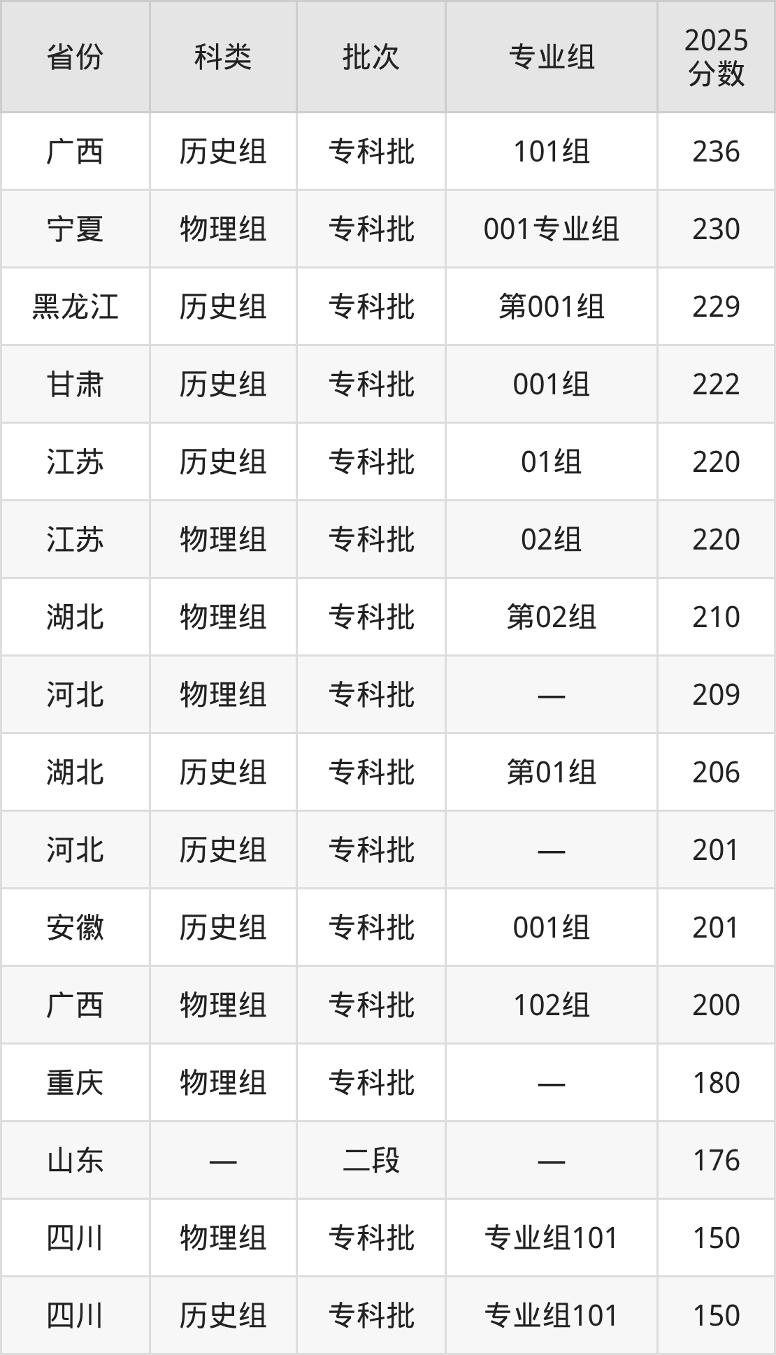 2025年资阳环境科技职业学院在全国普通批次招生的录取分数范围位于150~362分之间,其中省内分数在150分,物理组最低分专业组为“专业组101”,考生150分即可报考,历史组最低分专业组为“专业组101”,考生150分即可报考。