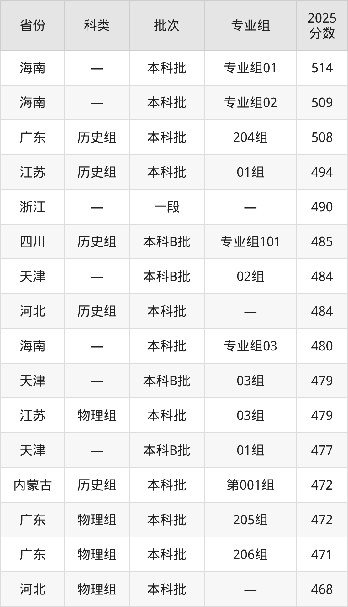 而海南地区考生的分数门槛最高,2025年西安工商学院专业组01在海南招生最低分为514分,考生至少要超本科线34分才有可能被录取。
