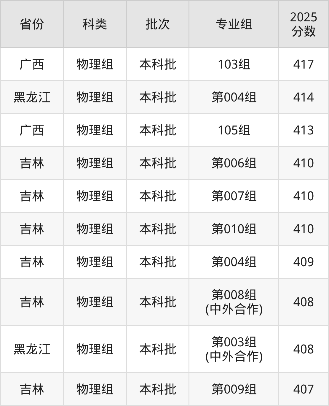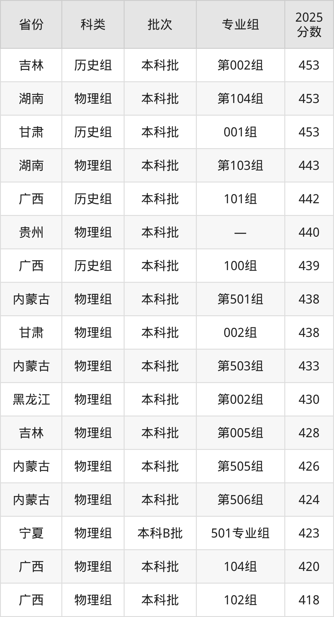 吉林农业科技学院在省外招生的最低分为408分,其中黑龙江地区物理组考生上吉林农业科技学院的分数门槛最低,考生成绩超本科线48分(408分)可上。其次是广西物理组考生,上吉林农业科技学院至少要超本科线43分(413分)。