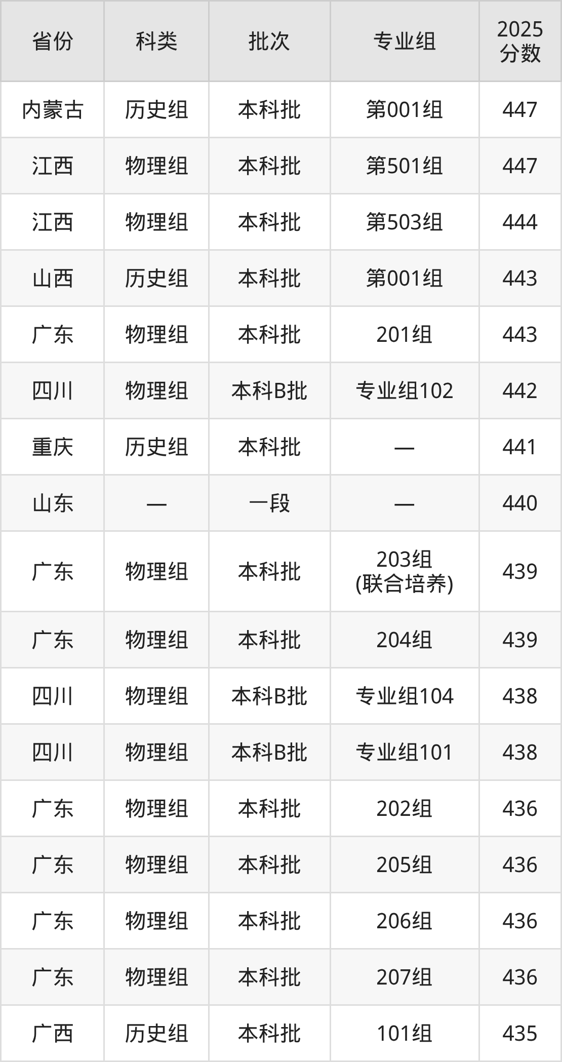 2025年广州华立学院在全国普通批次招生的录取分数范围位于355~499分之间,其中省内分数范围为436分~467分,历史组最低分专业组为“208组”,考生464分即可报考,物理组最低分专业组为“202组”,考生436分即可报考。