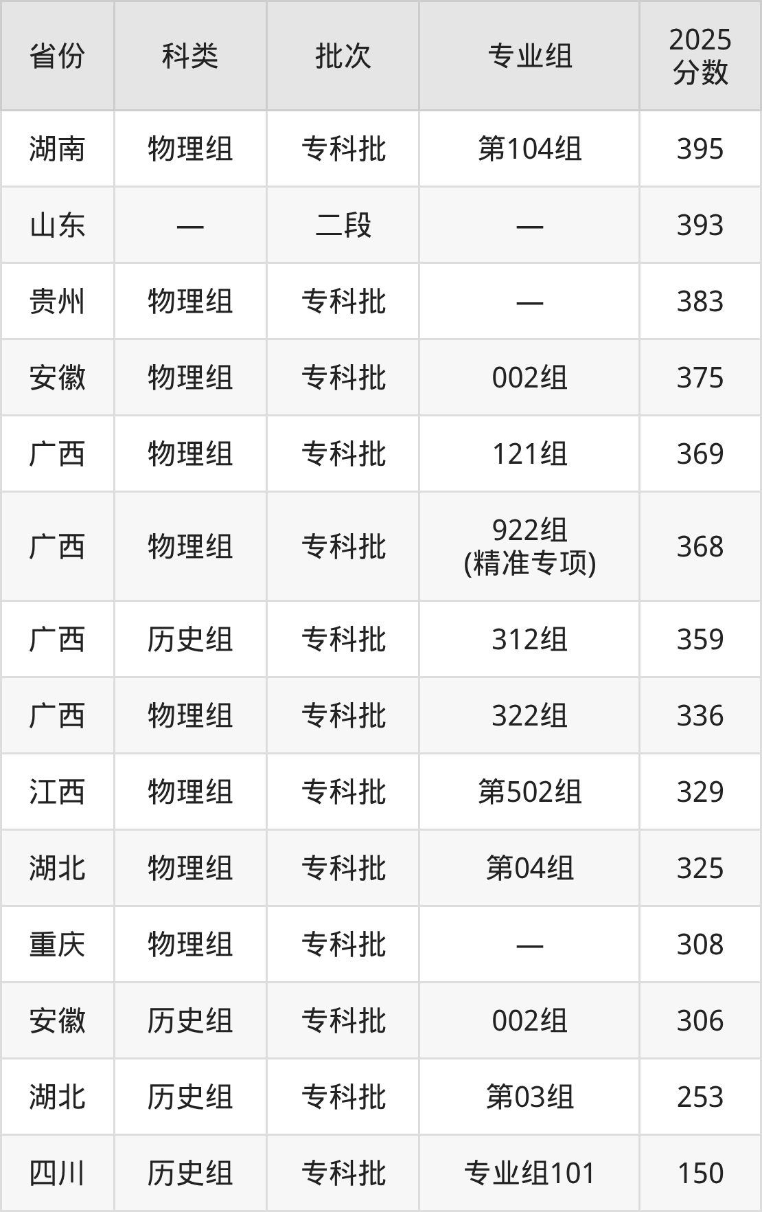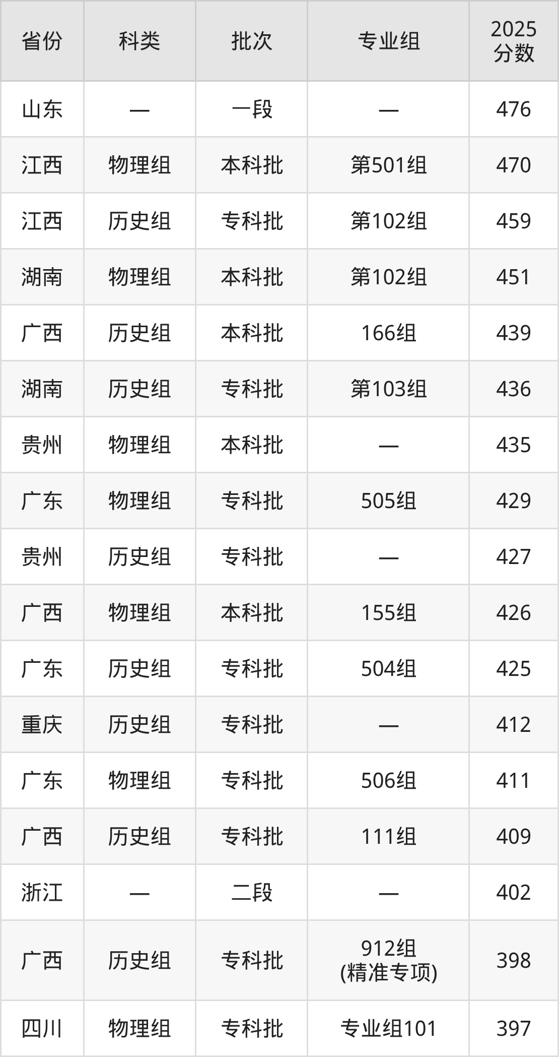 下面是南宁职业技术大学2025年在全国各省的录取分数线一览表,供参考:
