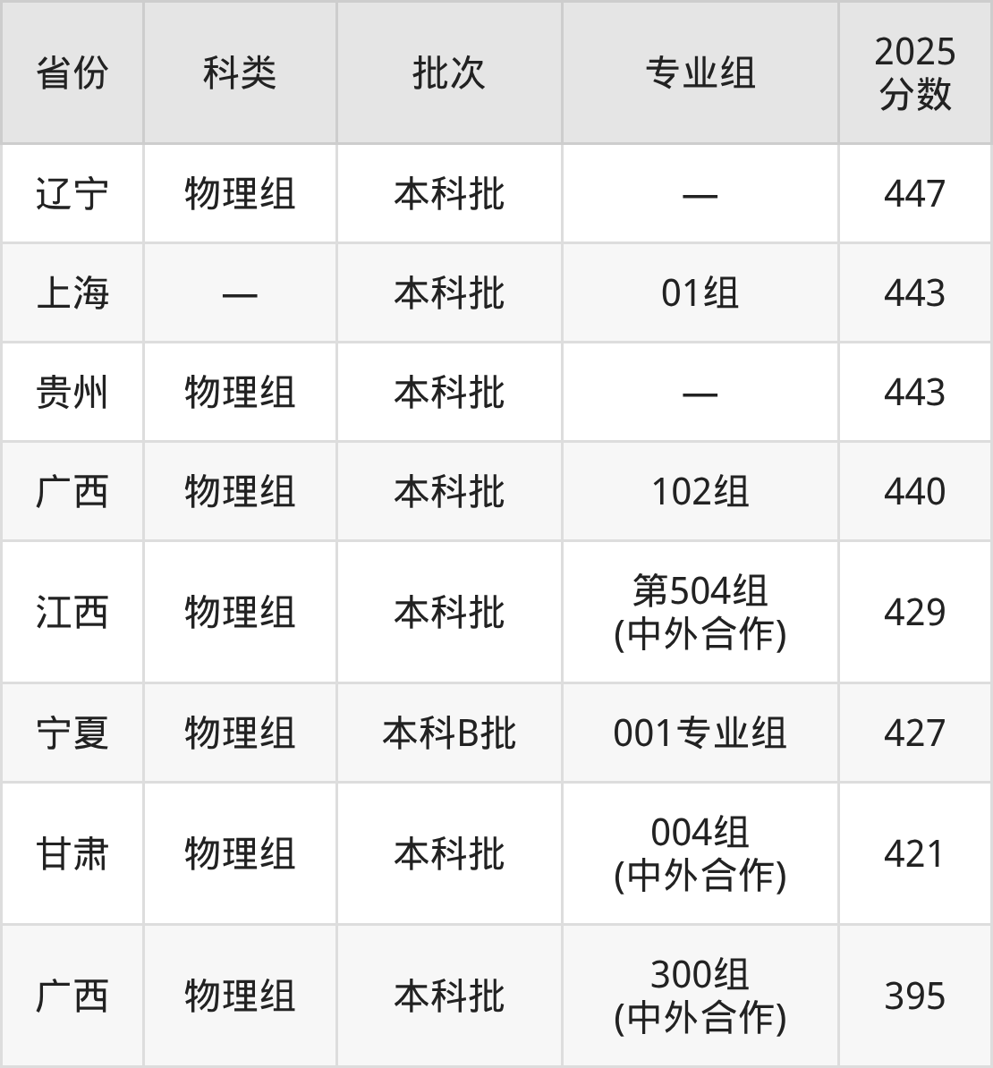 山东交通学院在省外招生的最低分为395分,其中广西地区物理组考生上山东交通学院的分数门槛最低,考生成绩超本科线25分(395分)可上。其次是甘肃物理组考生,上山东交通学院至少要超本科线47分(421分)。