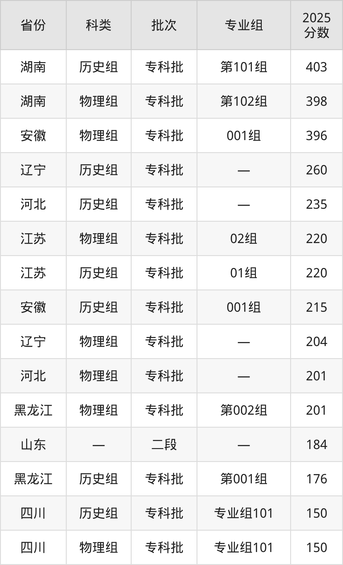 而湖南地区历史组考生的分数门槛最高,2025年曹妃甸职业技术学院第101组在湖南招生最低分为403分,考生至少要超专科线203分才有可能被录取。