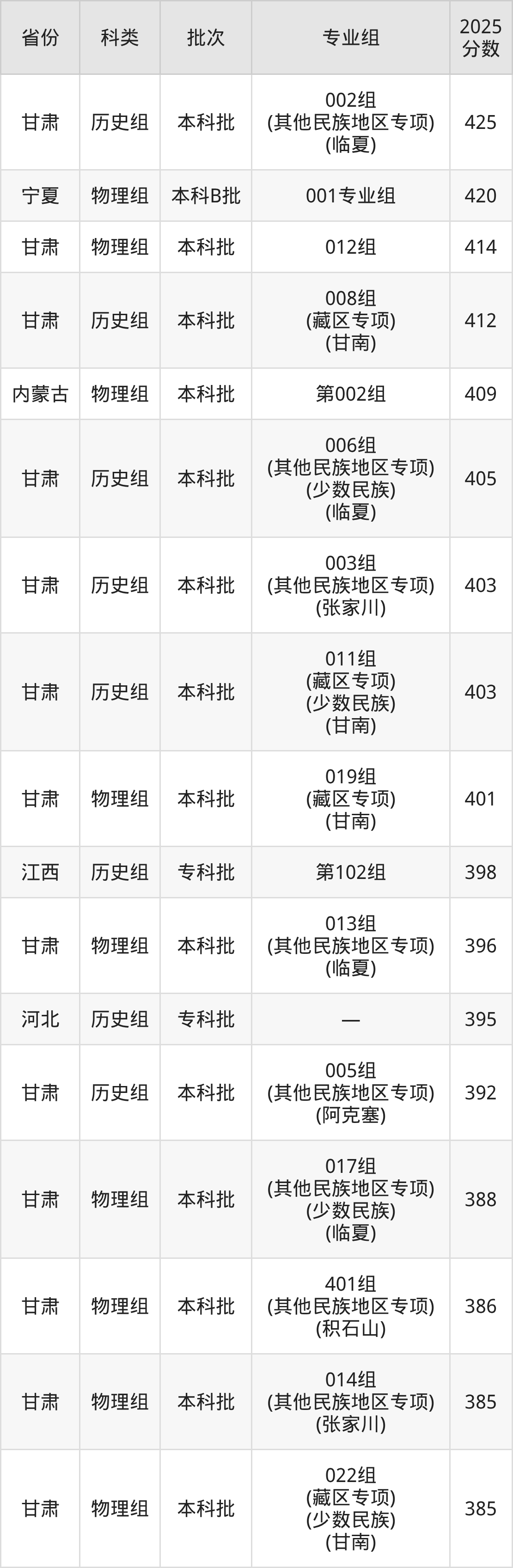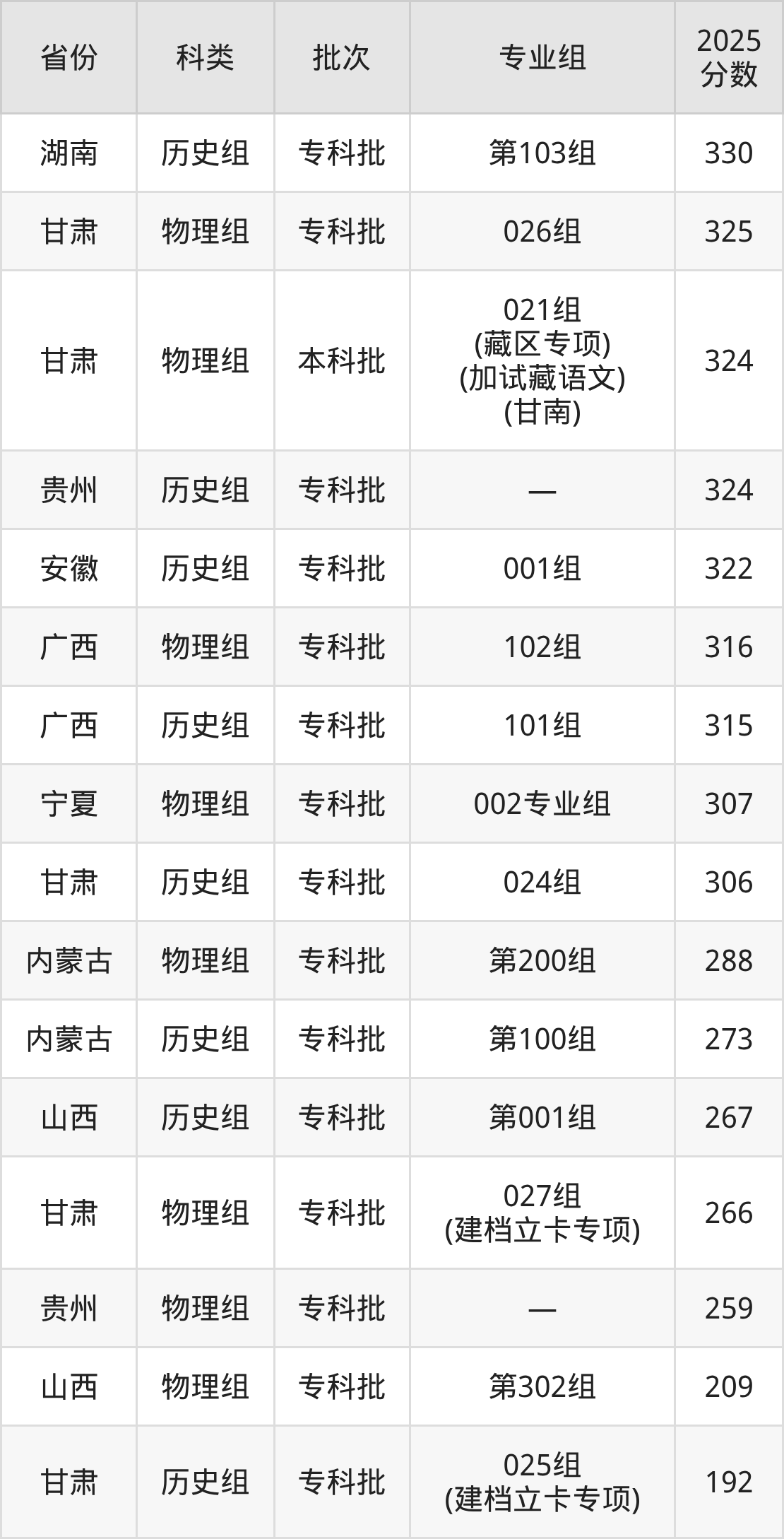下面是甘肃林业职业技术大学2025年在全国各省的录取分数线一览表,供参考: