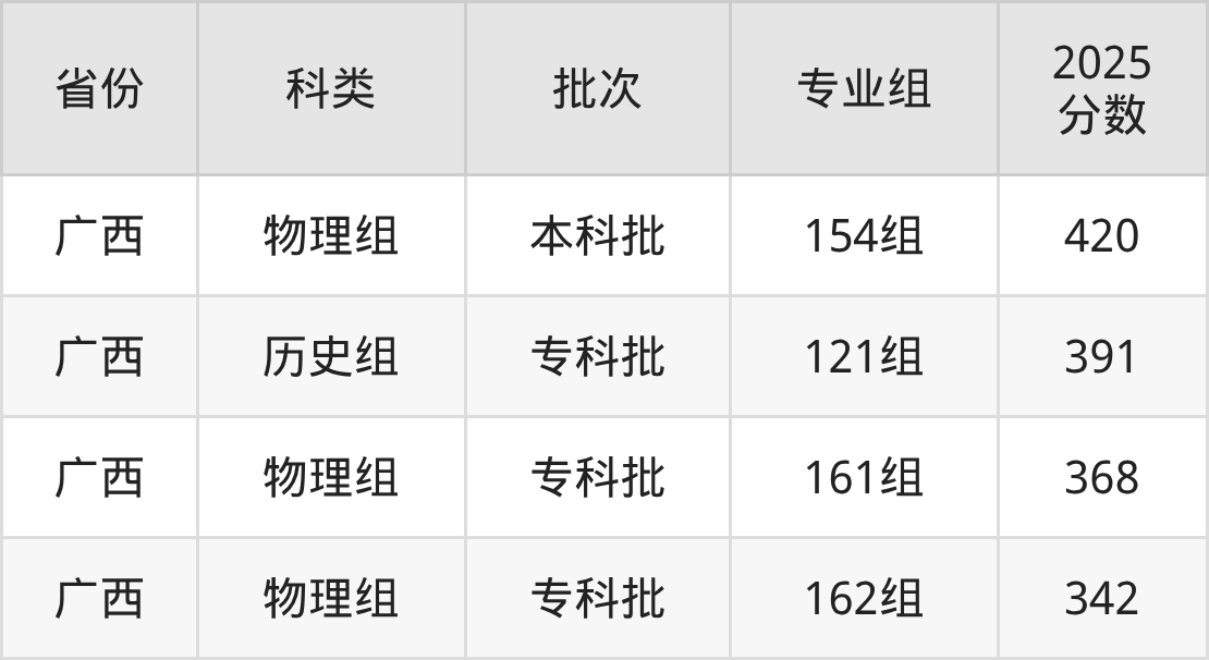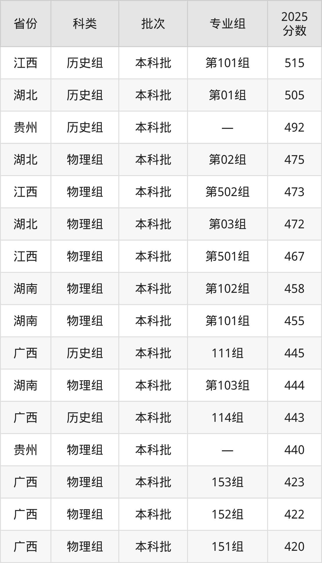 而江西地区历史组考生的分数门槛最高,2025年广西职业师范学院第101组在江西招生最低分为515分,考生至少要超本科线29分才有可能被录取。
