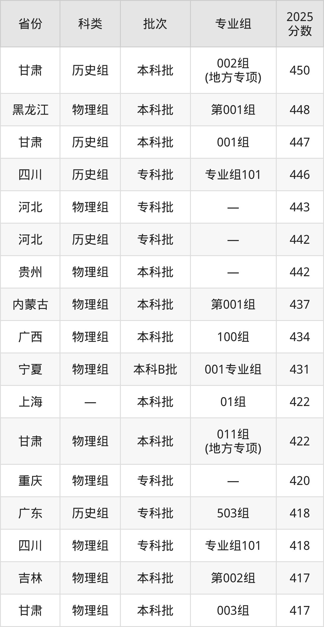 2025年兰州资源环境职业技术大学在全国普通批次招生的录取分数范围位于320~517分之间,其中省内分数范围为337分~450分,历史组最低分专业组为“024组(建档立卡专项)”,考生360分即可报考,物理组最低分专业组为“005组(藏区专项)(加试藏语文)(甘南)”,考生337分即可报考。