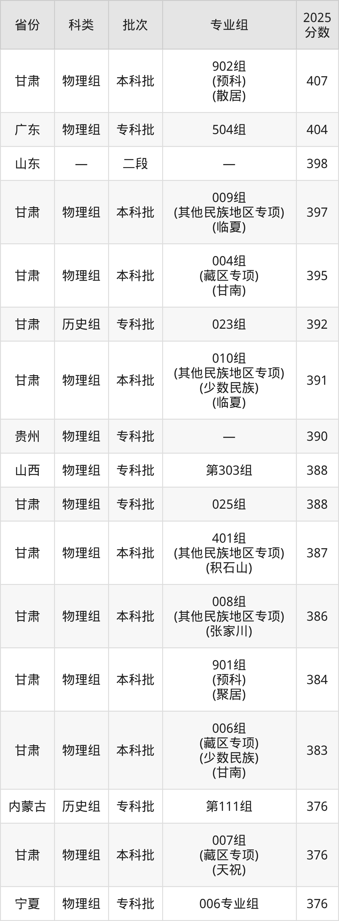 下面是兰州资源环境职业技术大学2025年在全国各省的录取分数线一览表,供参考: