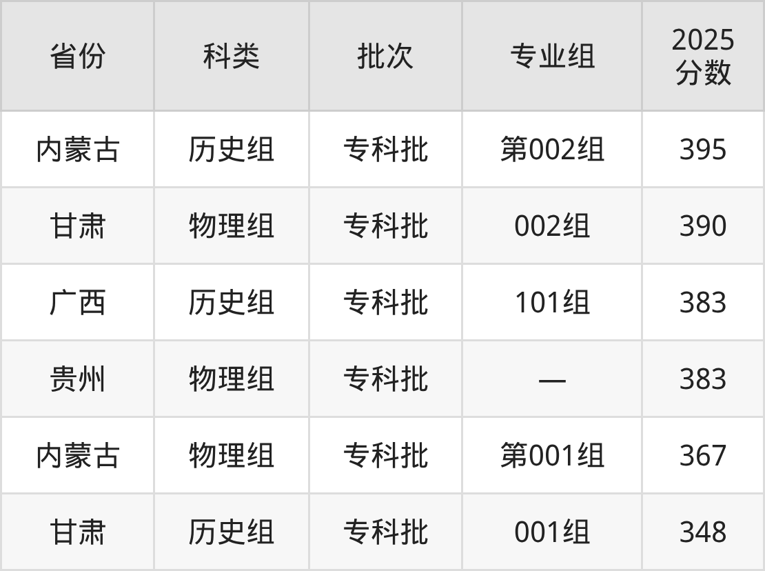 2025年湖南信息职业技术学院在全国普通批次招生的录取分数范围位于348~491分之间,其中省内分数范围为399分~413分,历史组最低分专业组为“第101组”,考生413分即可报考,物理组最低分专业组为“第102组”,考生399分即可报考。