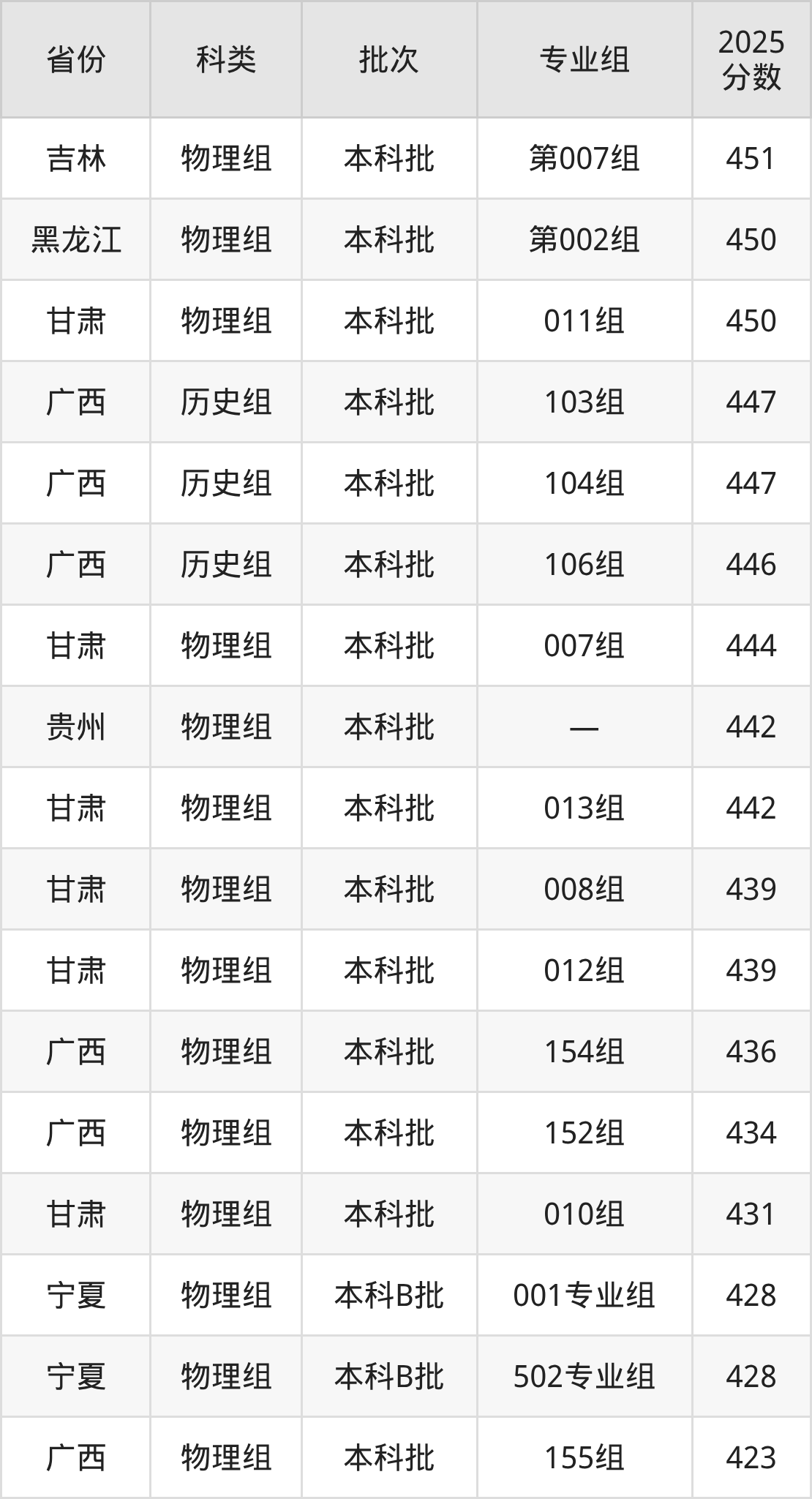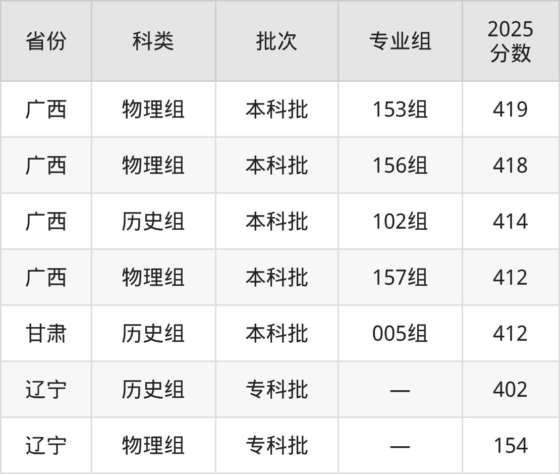 鞍山师范学院在省外招生的最低分为412分,其中广西地区物理组考生上鞍山师范学院的分数门槛最低,考生成绩超本科线42分(412分)可上。其次是甘肃历史组考生,上鞍山师范学院至少要超本科线0分(412分)。