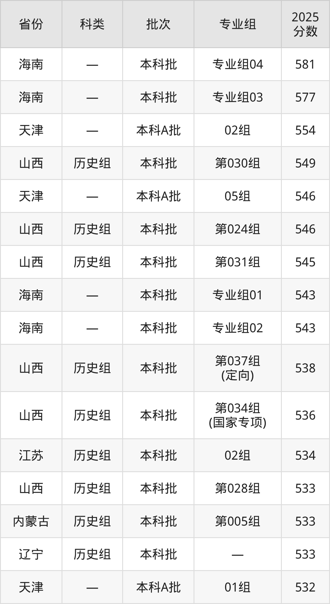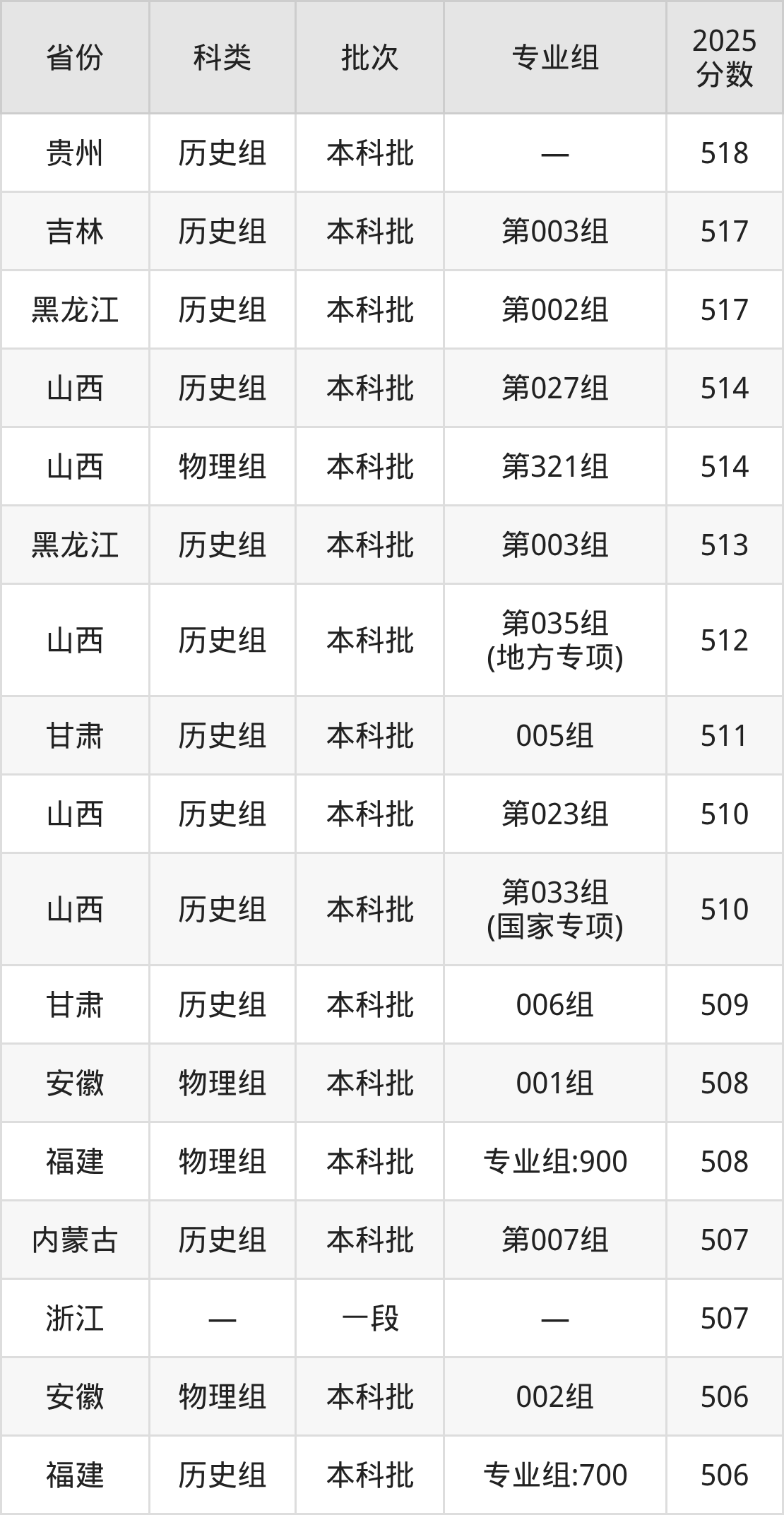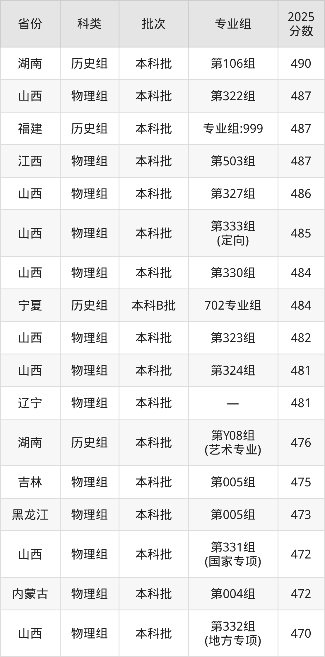 2025年太原师范学院在全国普通批次招生的录取分数范围位于418~581分之间,其中省内分数范围为470分~549分,物理组最低分专业组为“第332组(地方专项)”,考生470分即可报考,历史组最低分专业组为“第029组”,考生500分即可报考。