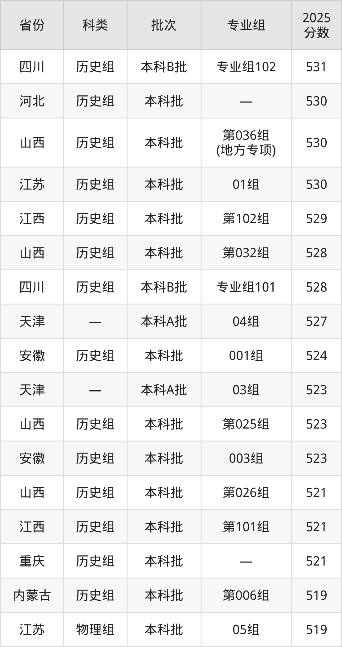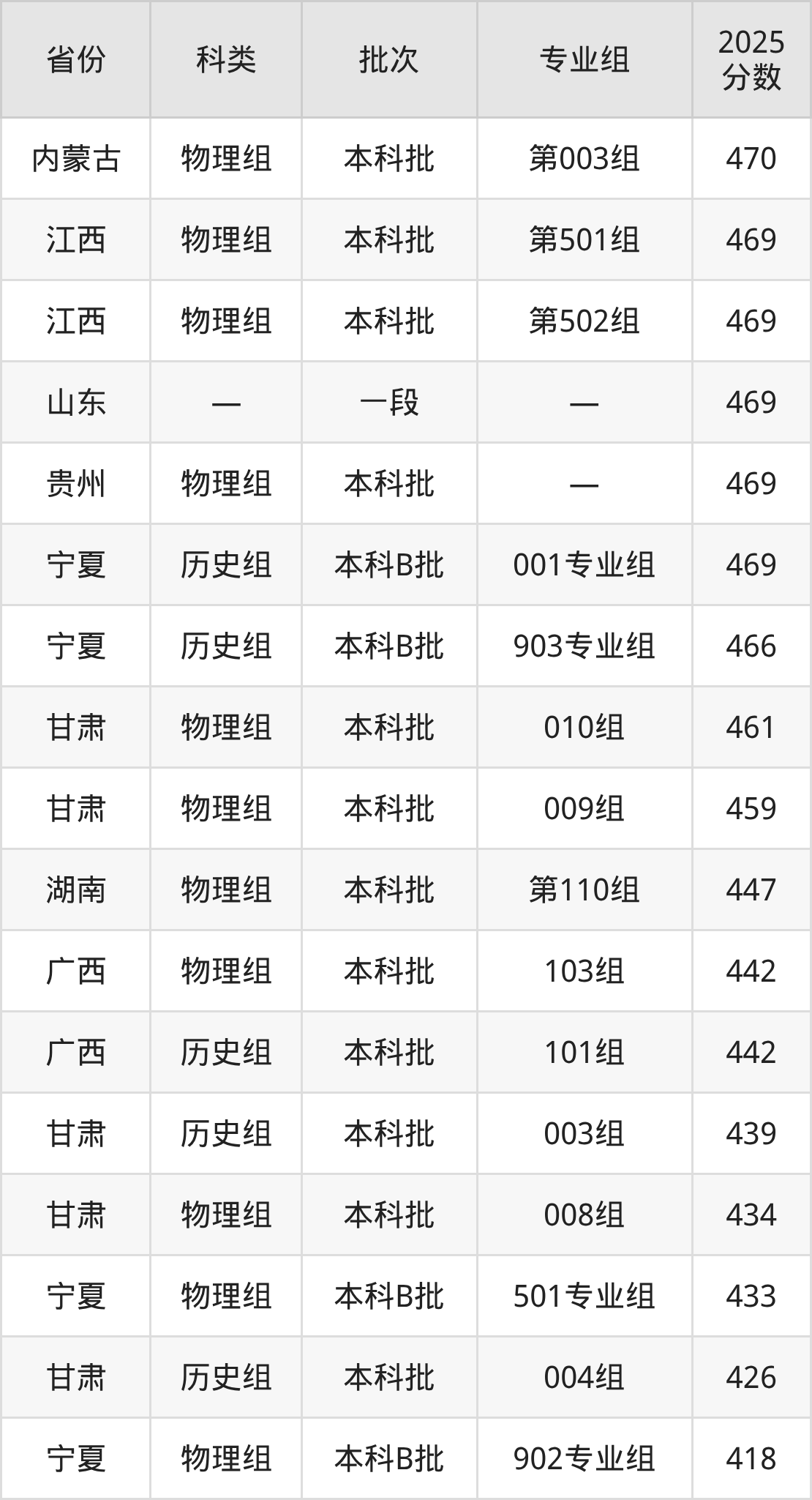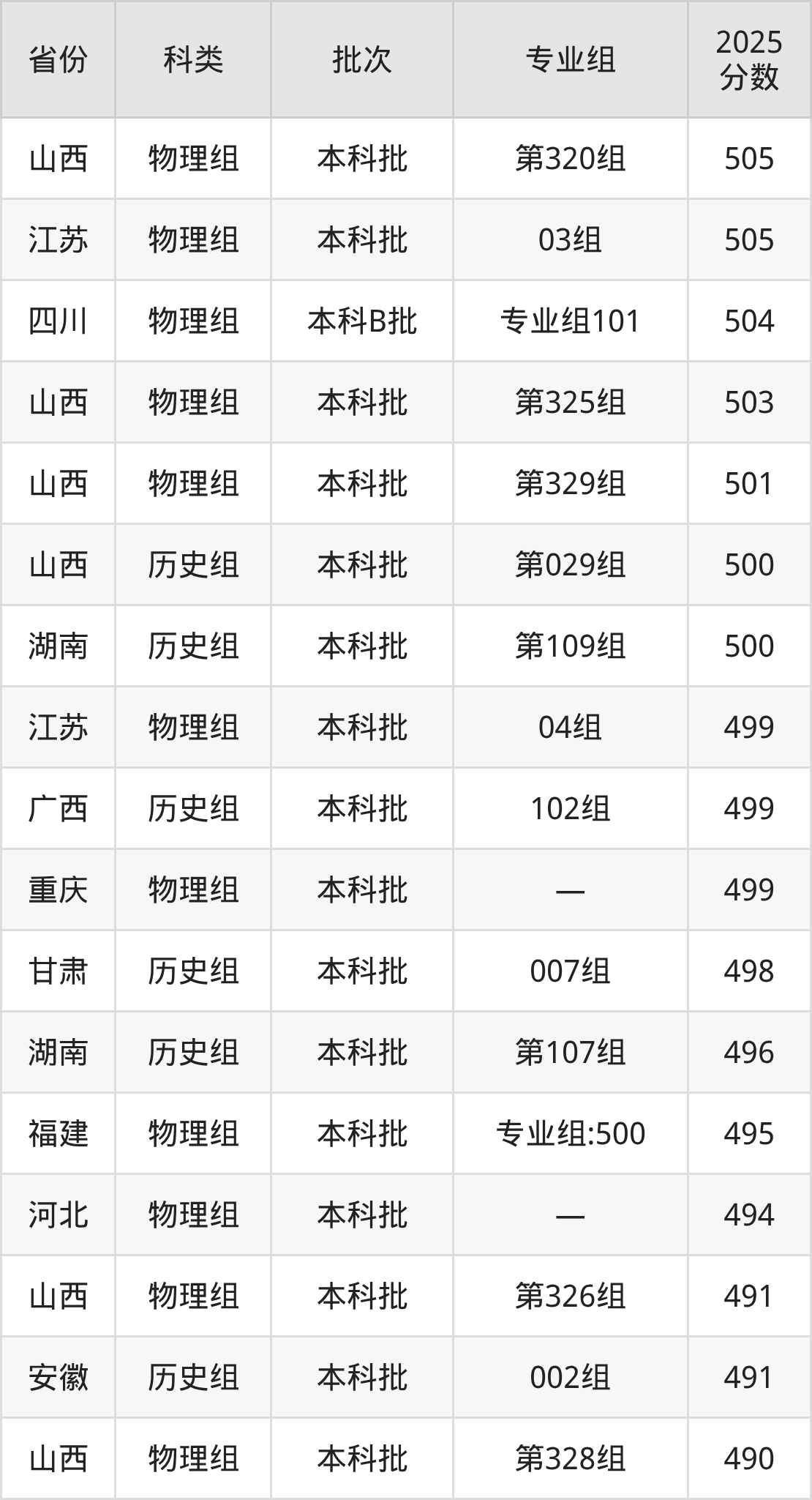 2025年太原师范学院在全国普通批次招生的录取分数范围位于418~581分之间,其中省内分数范围为470分~549分,物理组最低分专业组为“第332组(地方专项)”,考生470分即可报考,历史组最低分专业组为“第029组”,考生500分即可报考。