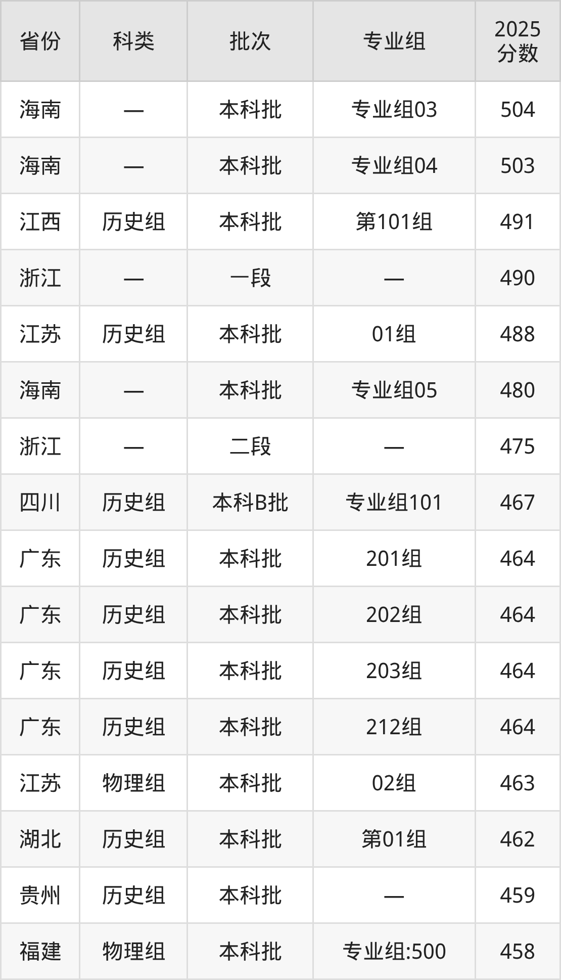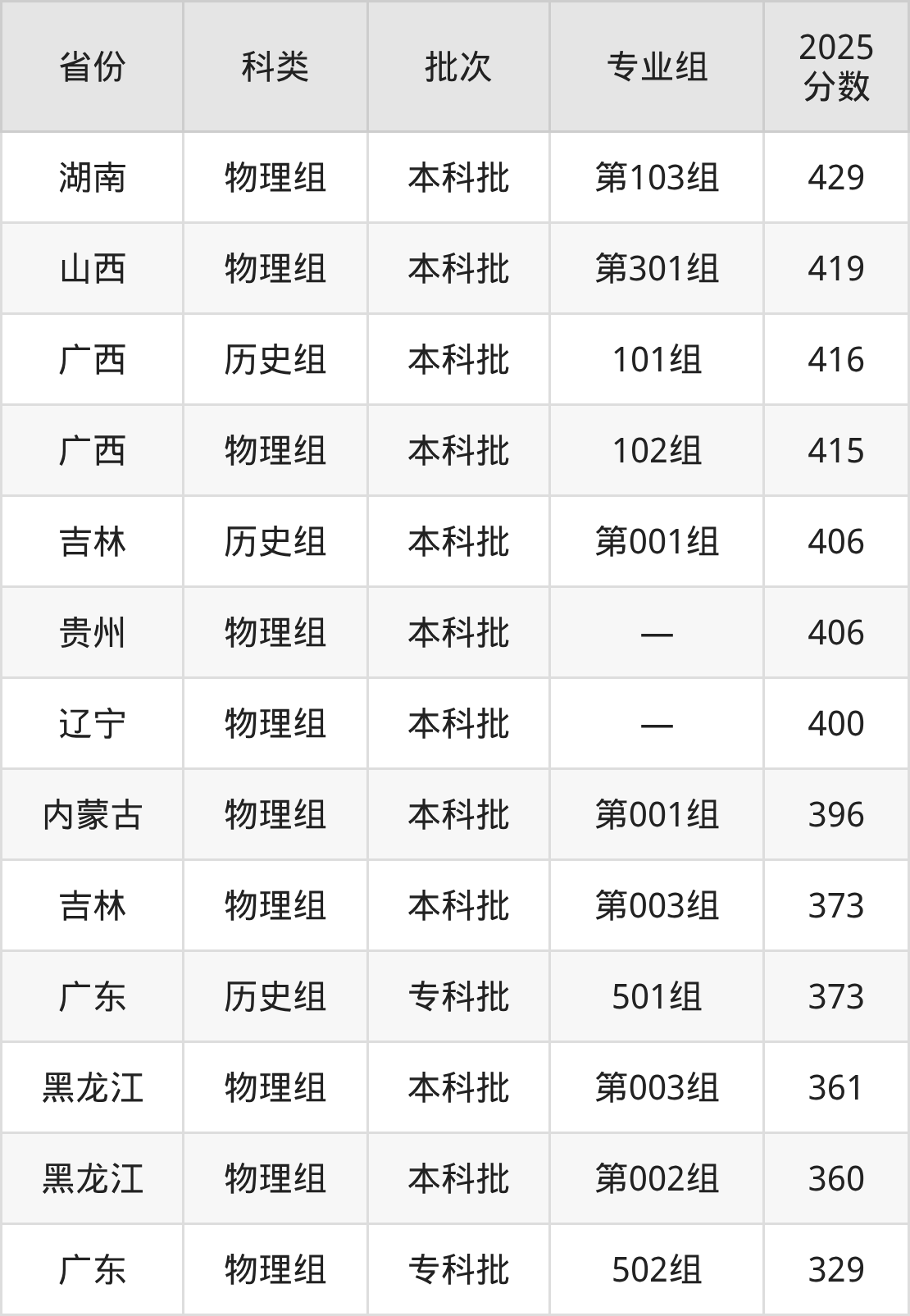 2025年广东理工学院在全国普通批次招生的录取分数范围位于329~504分之间,其中省内分数范围为329分~464分,历史组最低分专业组为“501组”,考生373分即可报考,物理组最低分专业组为“502组”,考生329分即可报考。