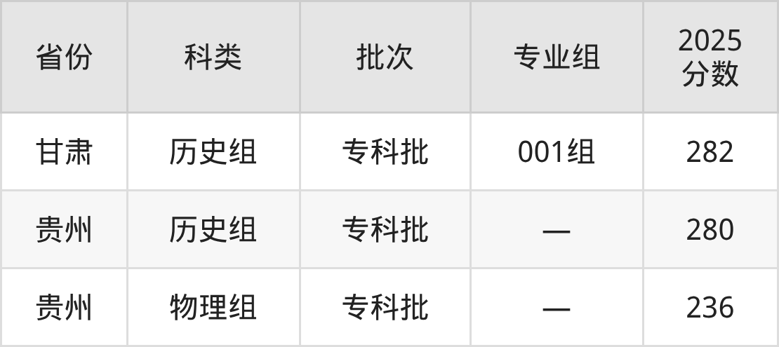 黑龙江职业学院在省外招生的最低分为236分,其中贵州地区物理组考生上黑龙江职业学院的分数门槛最低,考生成绩超专科线56分(236分)可上。其次是甘肃历史组考生,上黑龙江职业学院至少要超专科线122分(282分)。