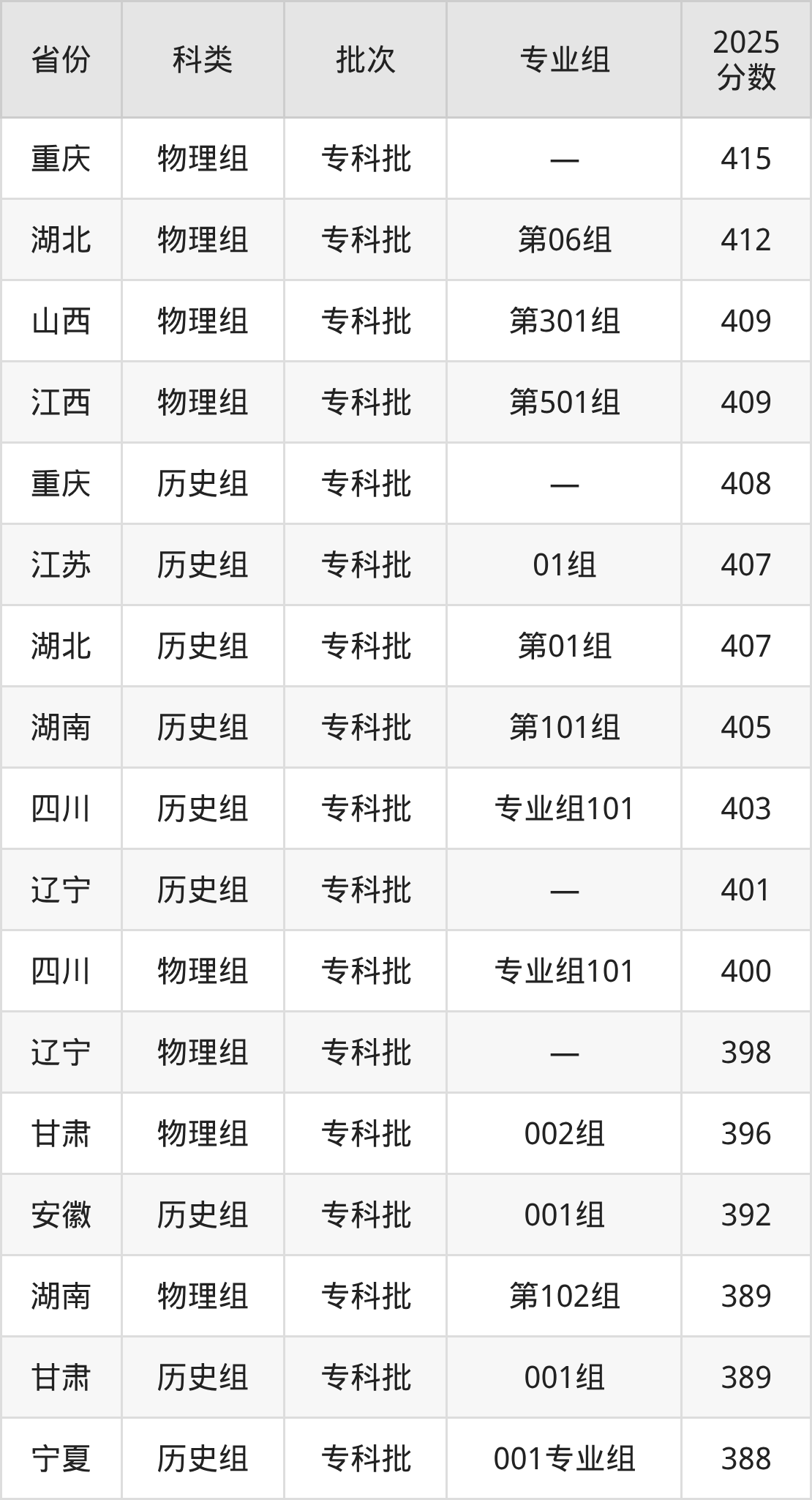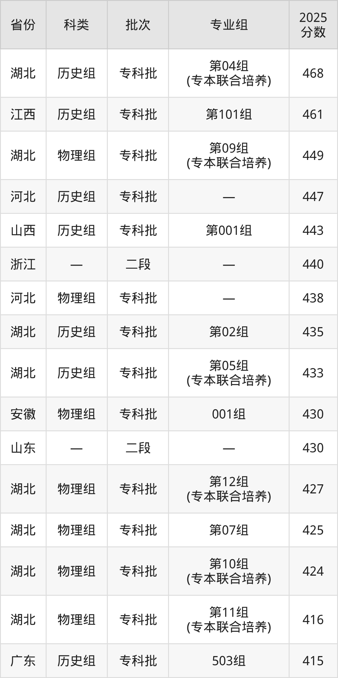 而江西地区历史组考生的分数门槛最高,2025年湖北水利水电职业技术学院第101组在江西招生最低分为461分,考生至少要超专科线171分才有可能被录取。