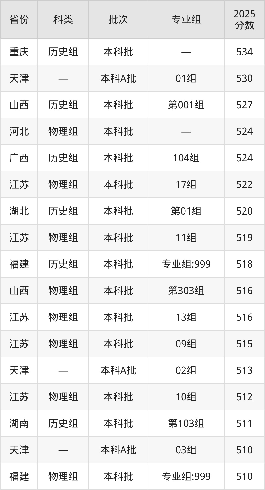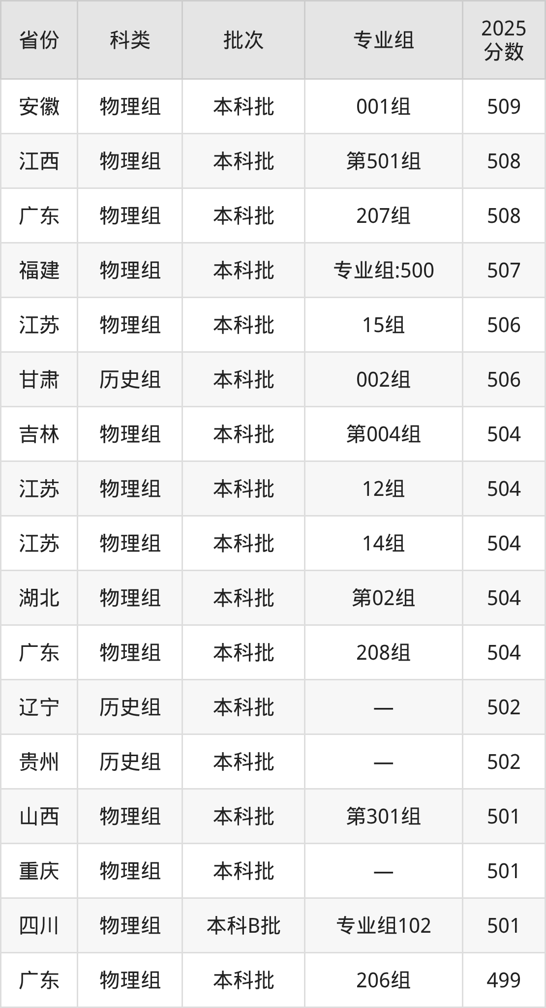 2025年盐城师范学院在全国普通批次招生的录取分数范围位于424~575分之间,其中省内分数范围为504分~549分,历史组最低分专业组为“03组”,考生534分即可报考,物理组最低分专业组为“12组”,考生504分即可报考。