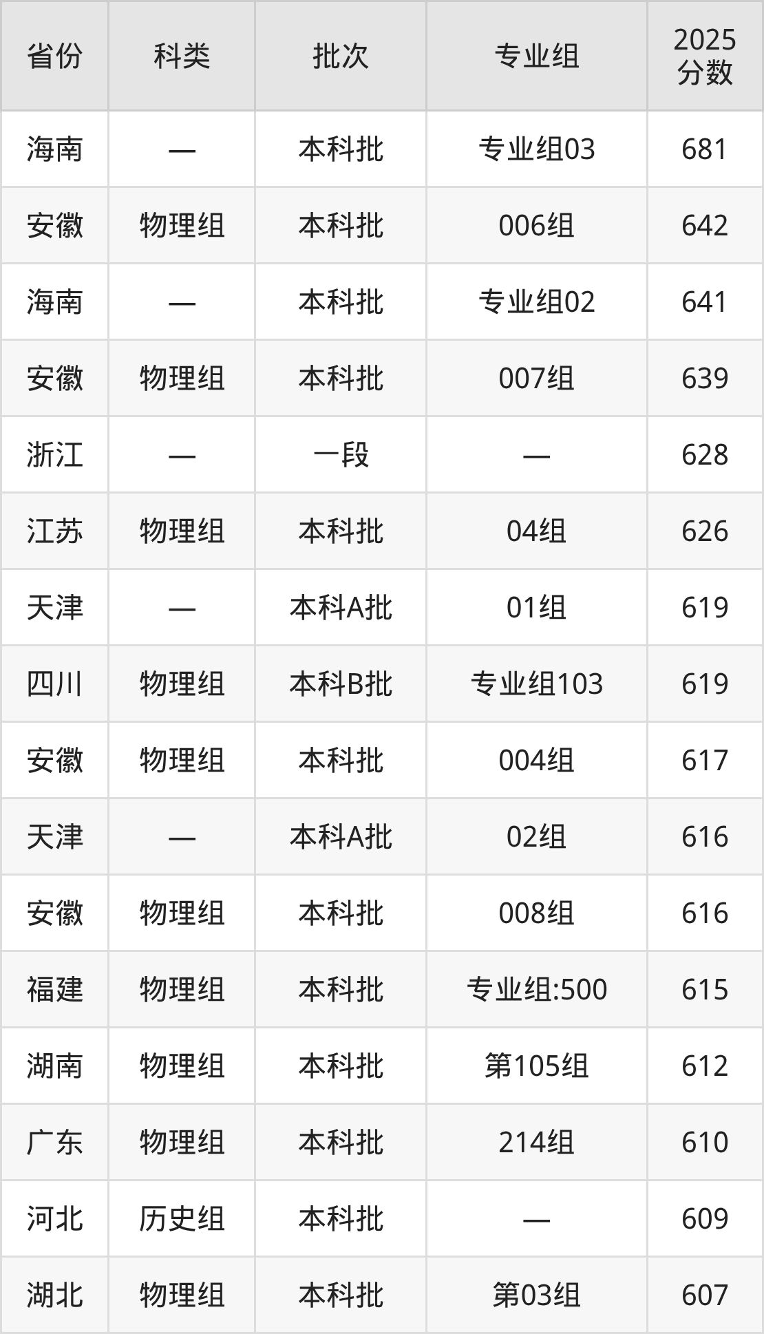 而海南地区考生的分数门槛最高,2025年合肥工业大学专业组03在海南招生最低分为681分,考生至少要超本科线201分才有可能被录取。