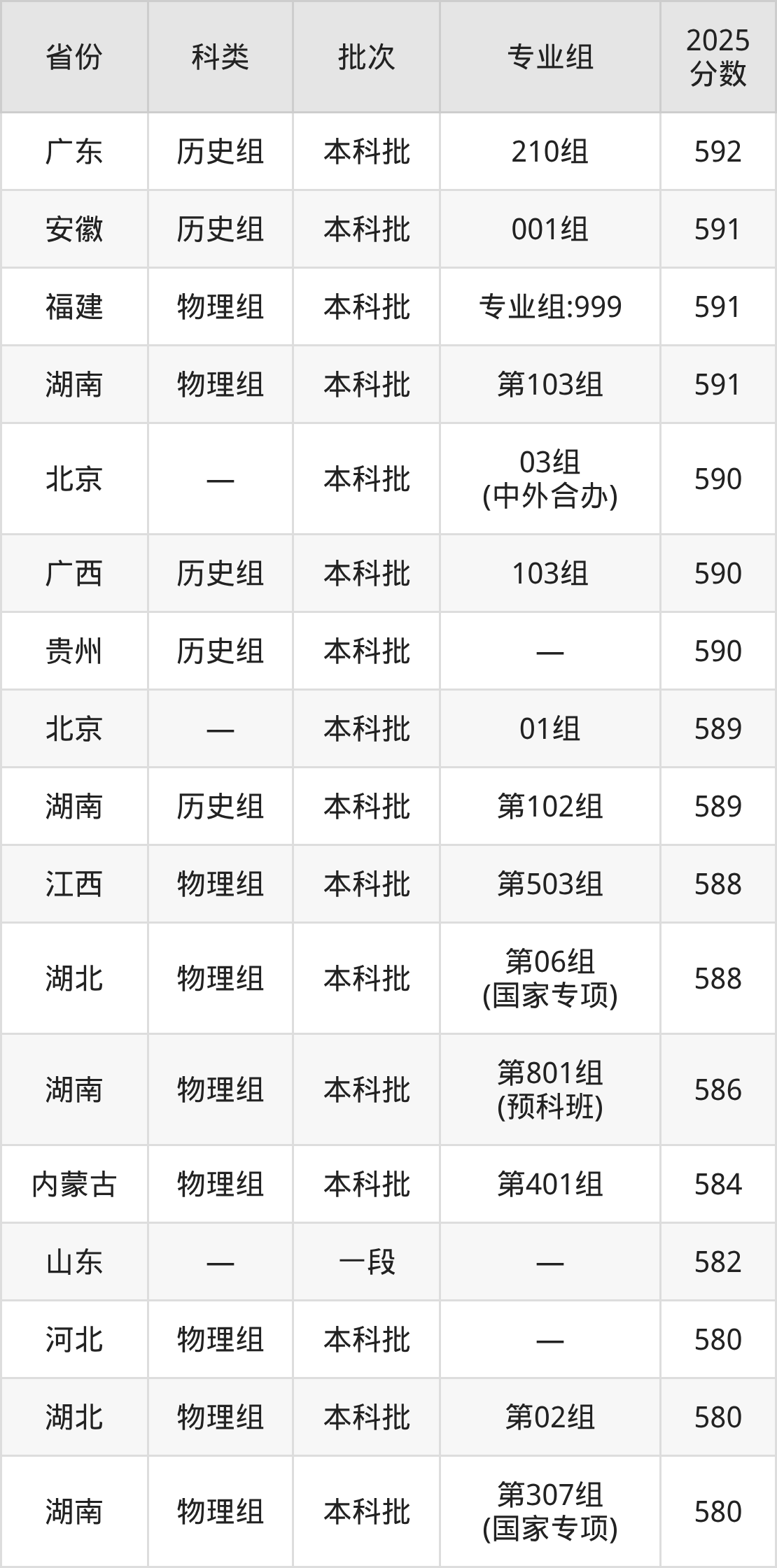 2025年合肥工业大学在全国普通批次招生的录取分数范围位于499~681分之间,其中省内分数范围为591分~642分,物理组最低分专业组为“005组(中外合作)”,考生592分即可报考,历史组最低分专业组为“001组”,考生591分即可报考。