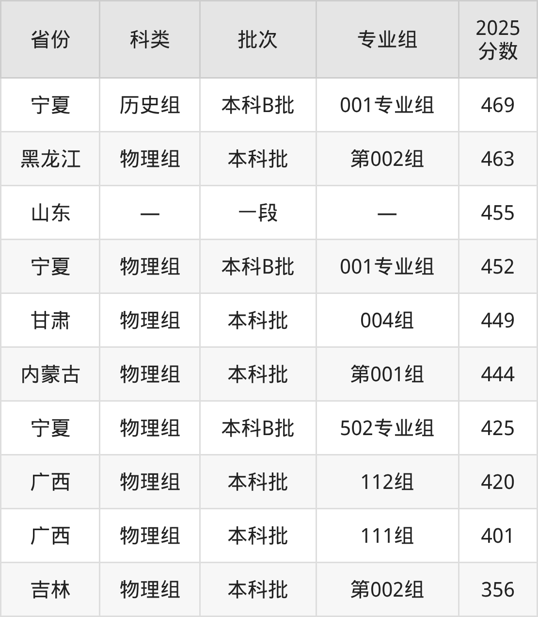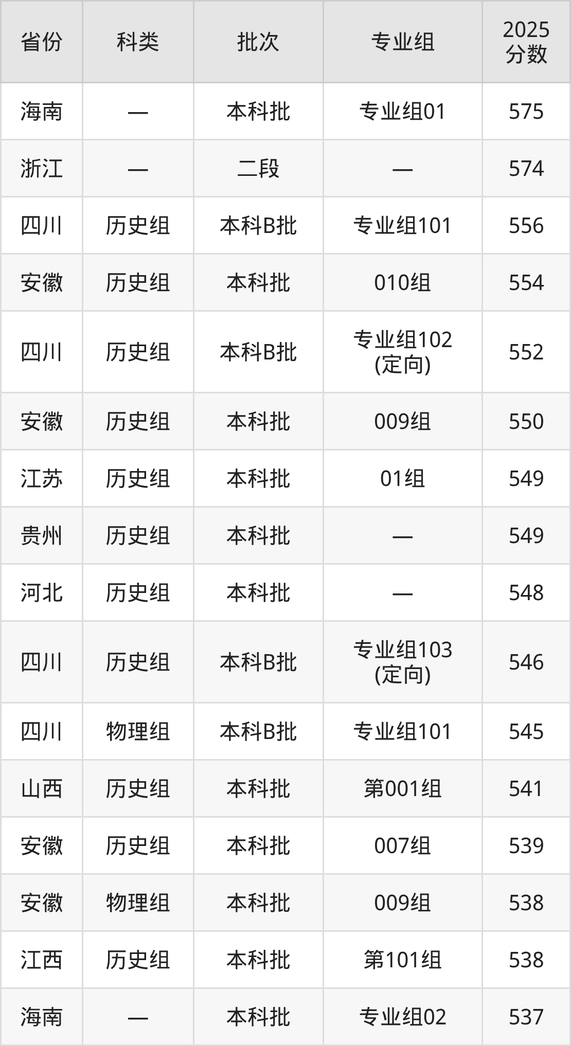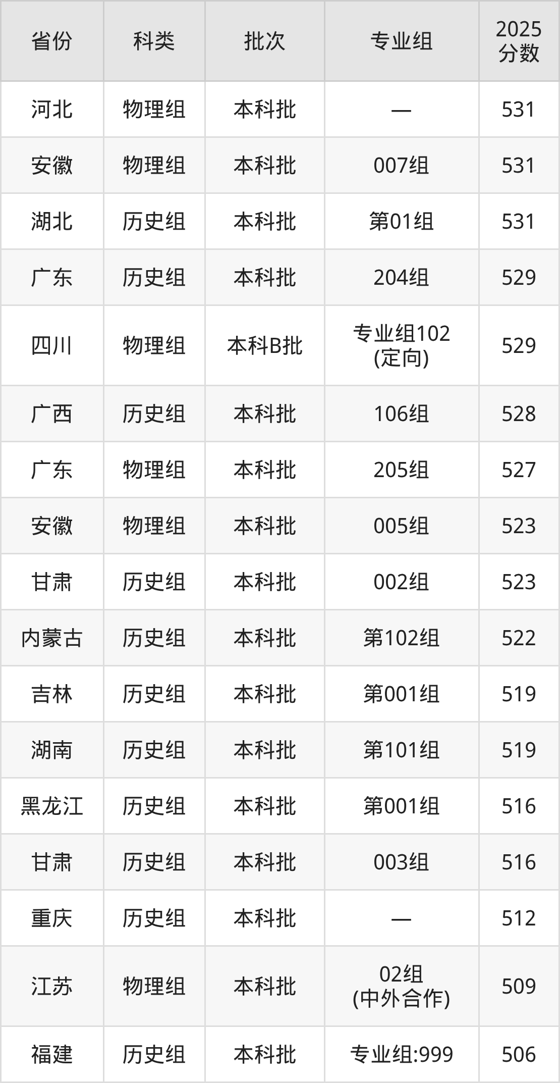 2025年安庆师范大学在全国普通批次招生的录取分数范围位于356~575分之间,其中省内分数范围为494分~554分,历史组最低分专业组为“007组”,考生539分即可报考,物理组最低分专业组为“008组(中外合作)”,考生494分即可报考。