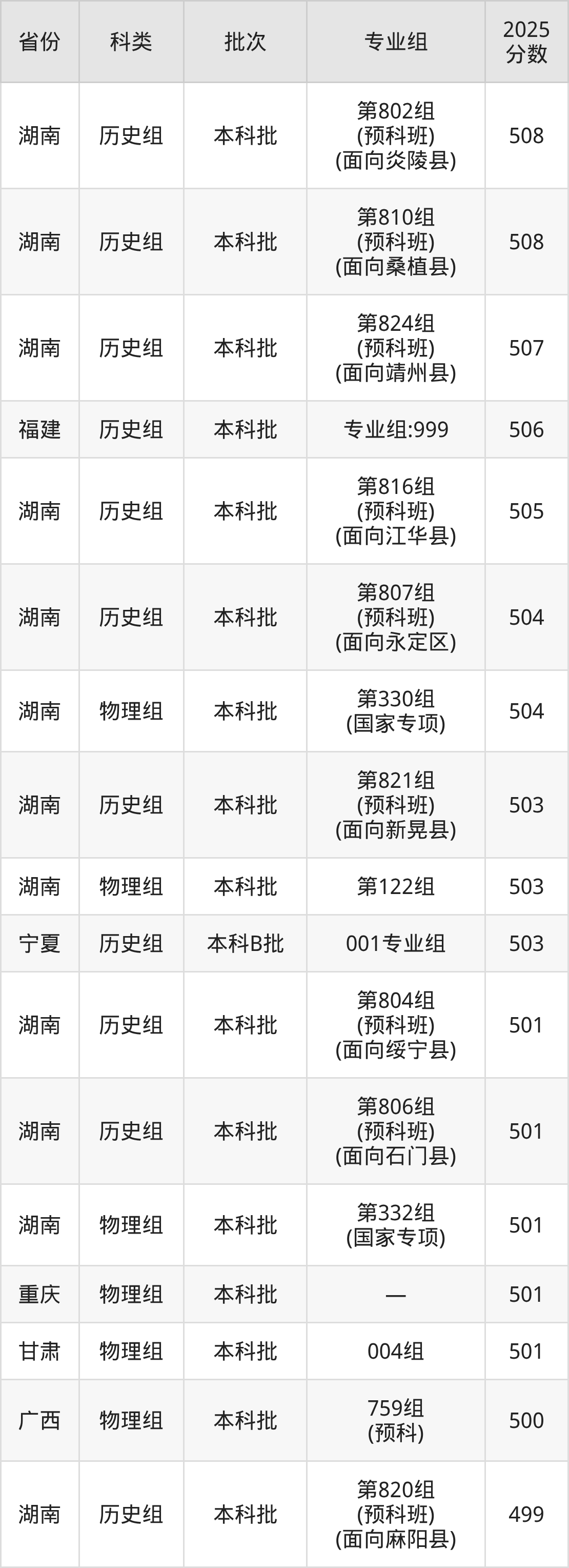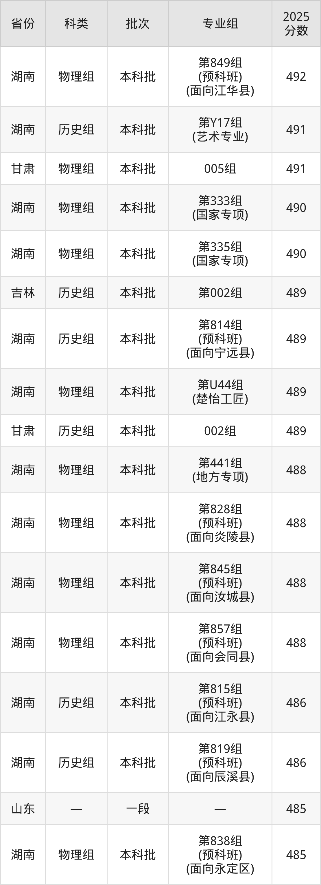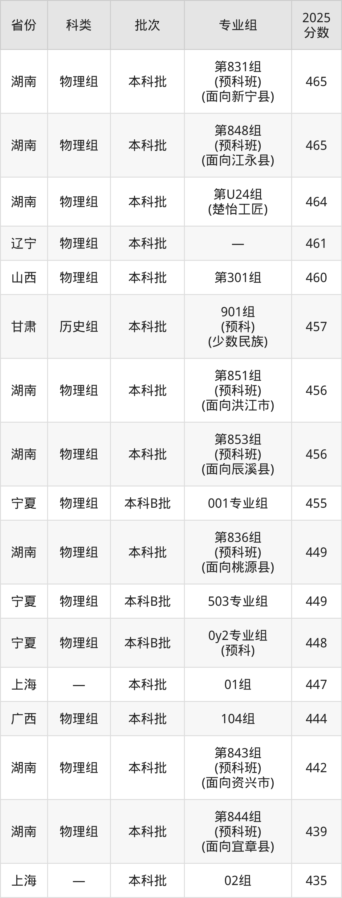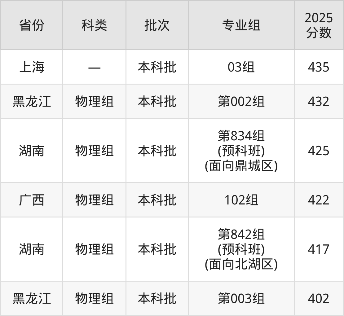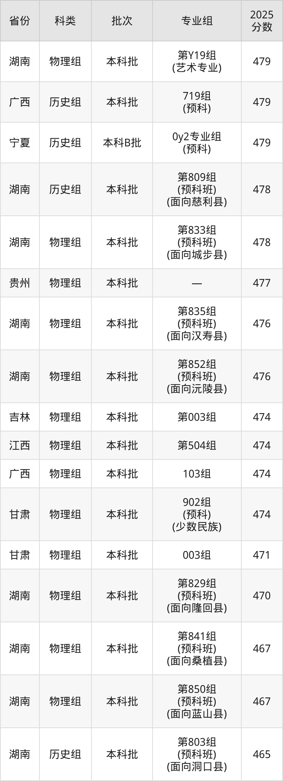2025年湖南工业大学在全国普通批次招生的录取分数范围位于402~600分之间,其中省内分数范围为417分~543分,物理组最低分专业组为“第842组(预科班)(面向北湖区)”,考生417分即可报考,历史组最低分专业组为“第803组(预科班)(面向洞口县)”,考生465分即可报考。