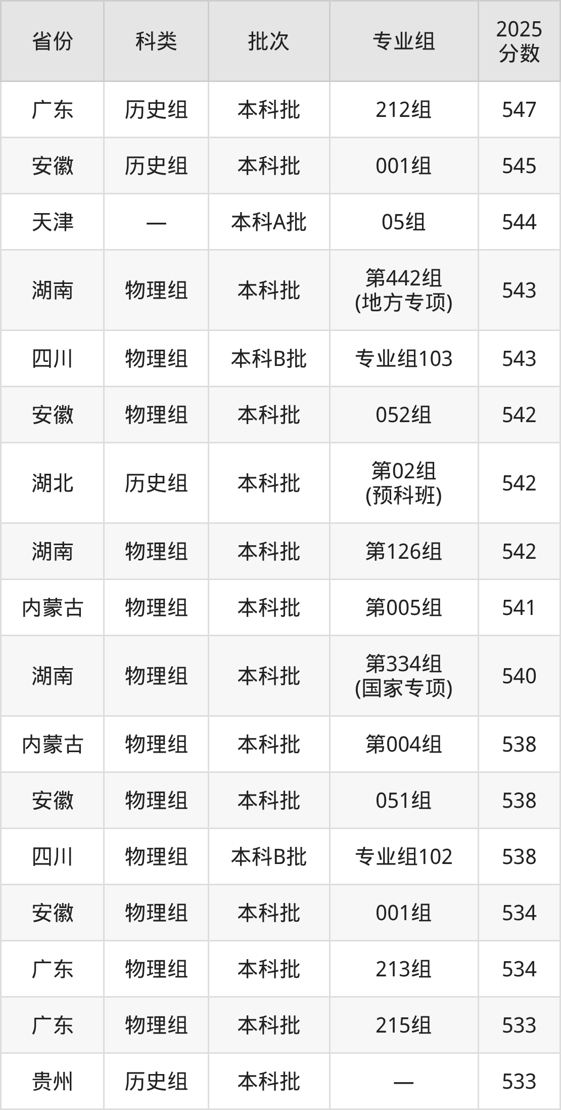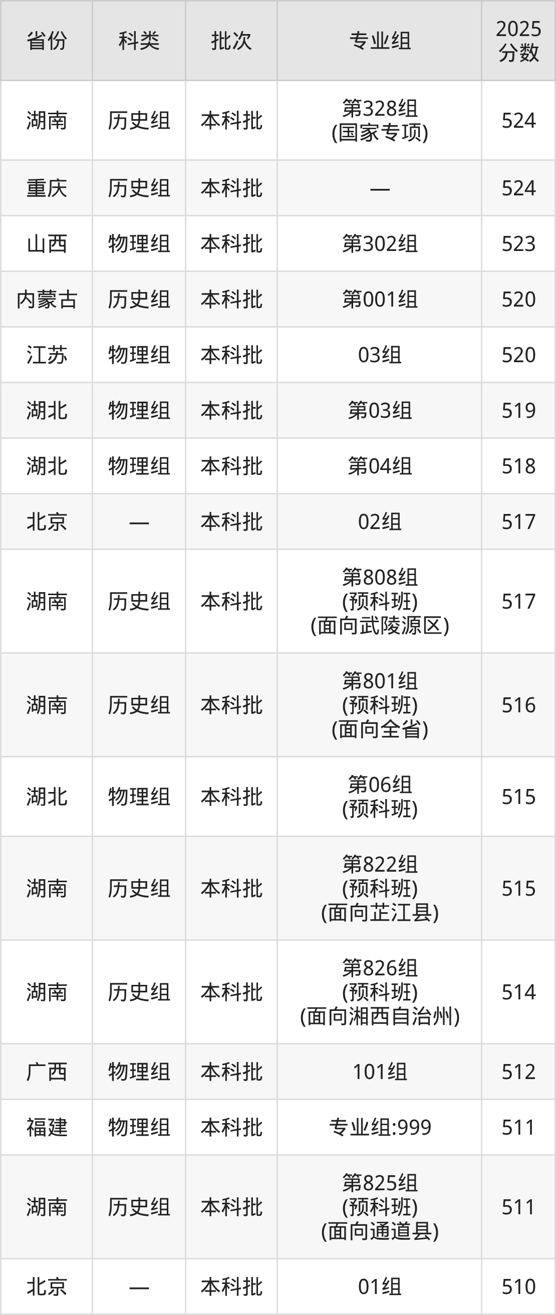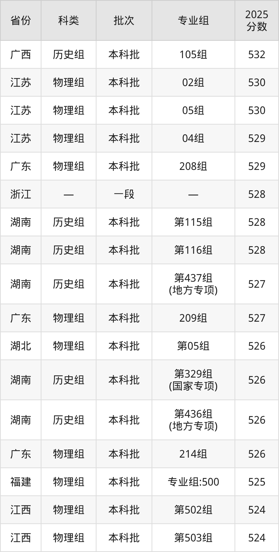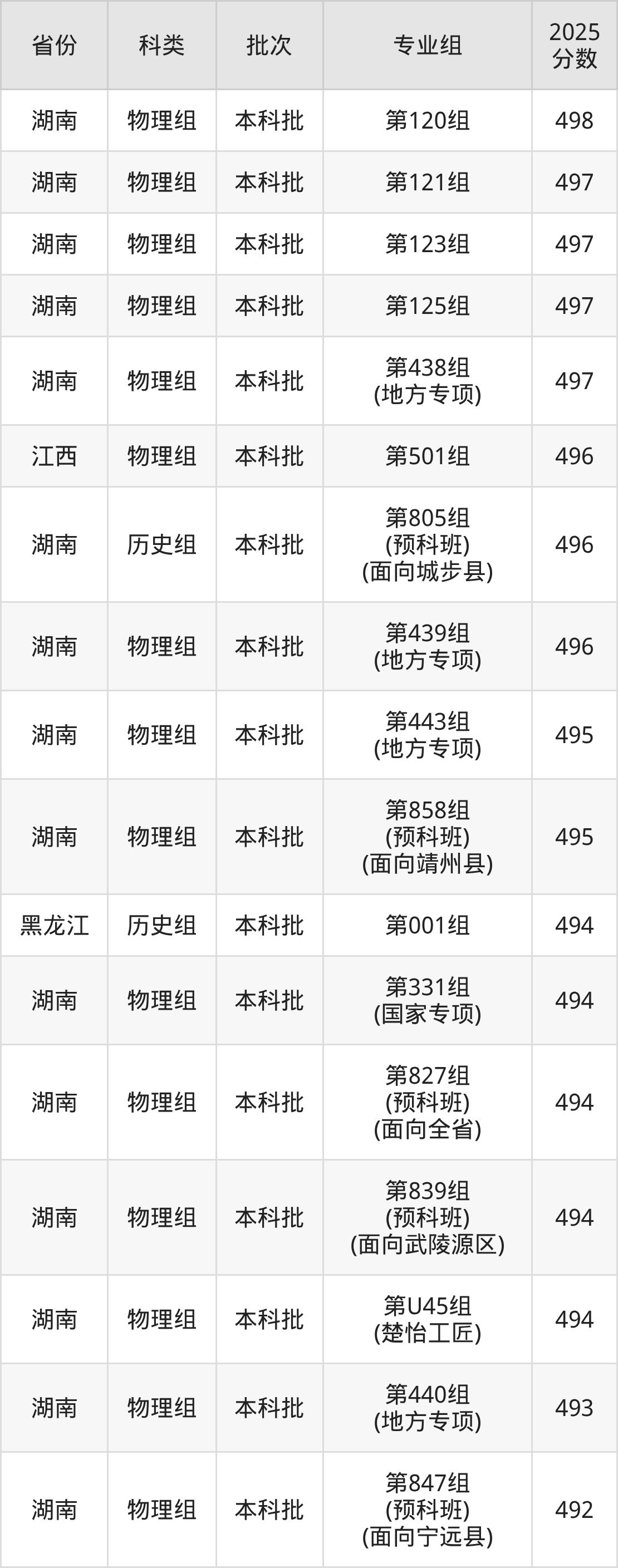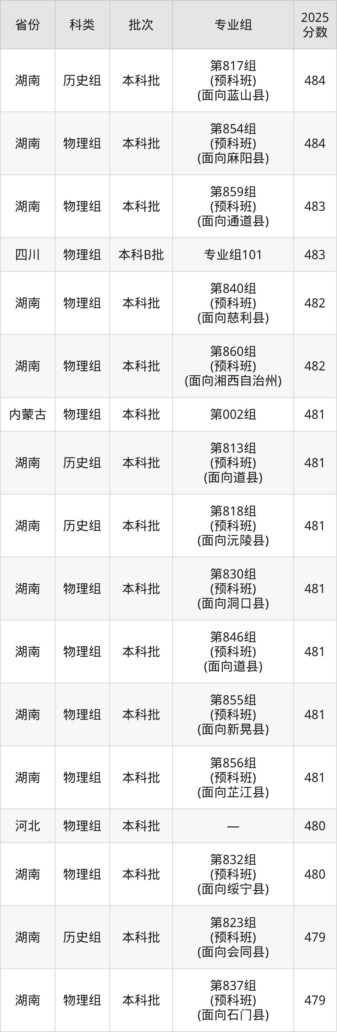 2025年湖南工业大学在全国普通批次招生的录取分数范围位于402~600分之间,其中省内分数范围为417分~543分,物理组最低分专业组为“第842组(预科班)(面向北湖区)”,考生417分即可报考,历史组最低分专业组为“第803组(预科班)(面向洞口县)”,考生465分即可报考。