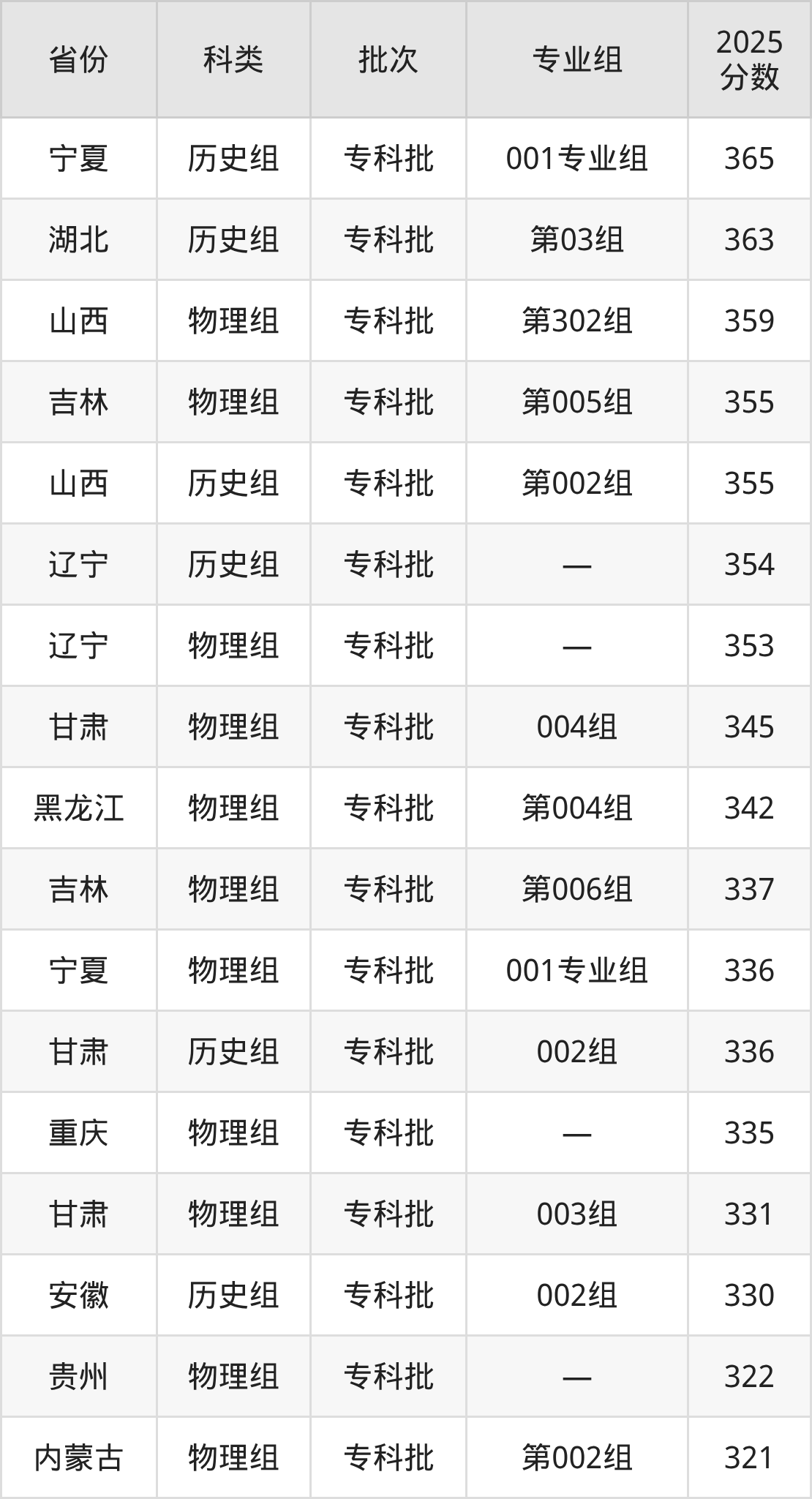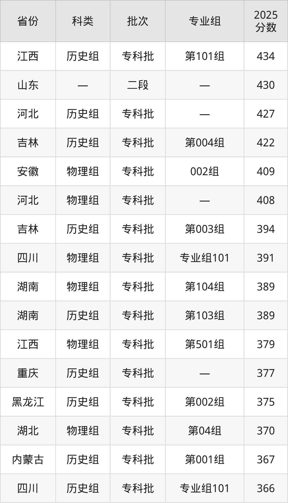 而江西地区历史组考生的分数门槛最高,2025年辽宁省交通高等专科学校第101组在江西招生最低分为434分,考生至少要超专科线144分才有可能被录取。