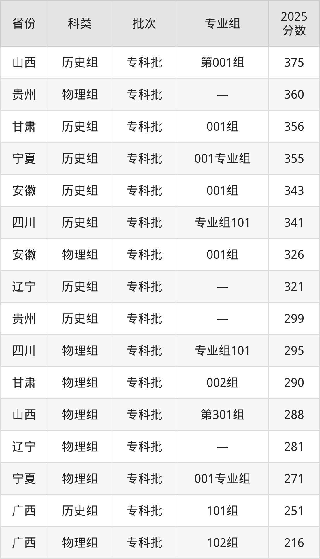 而山西地区历史组考生的分数门槛最高,2025年辽宁特殊教育师范高等专科学校第001组在山西招生最低分为375分,考生至少要超专科线275分才有可能被录取。