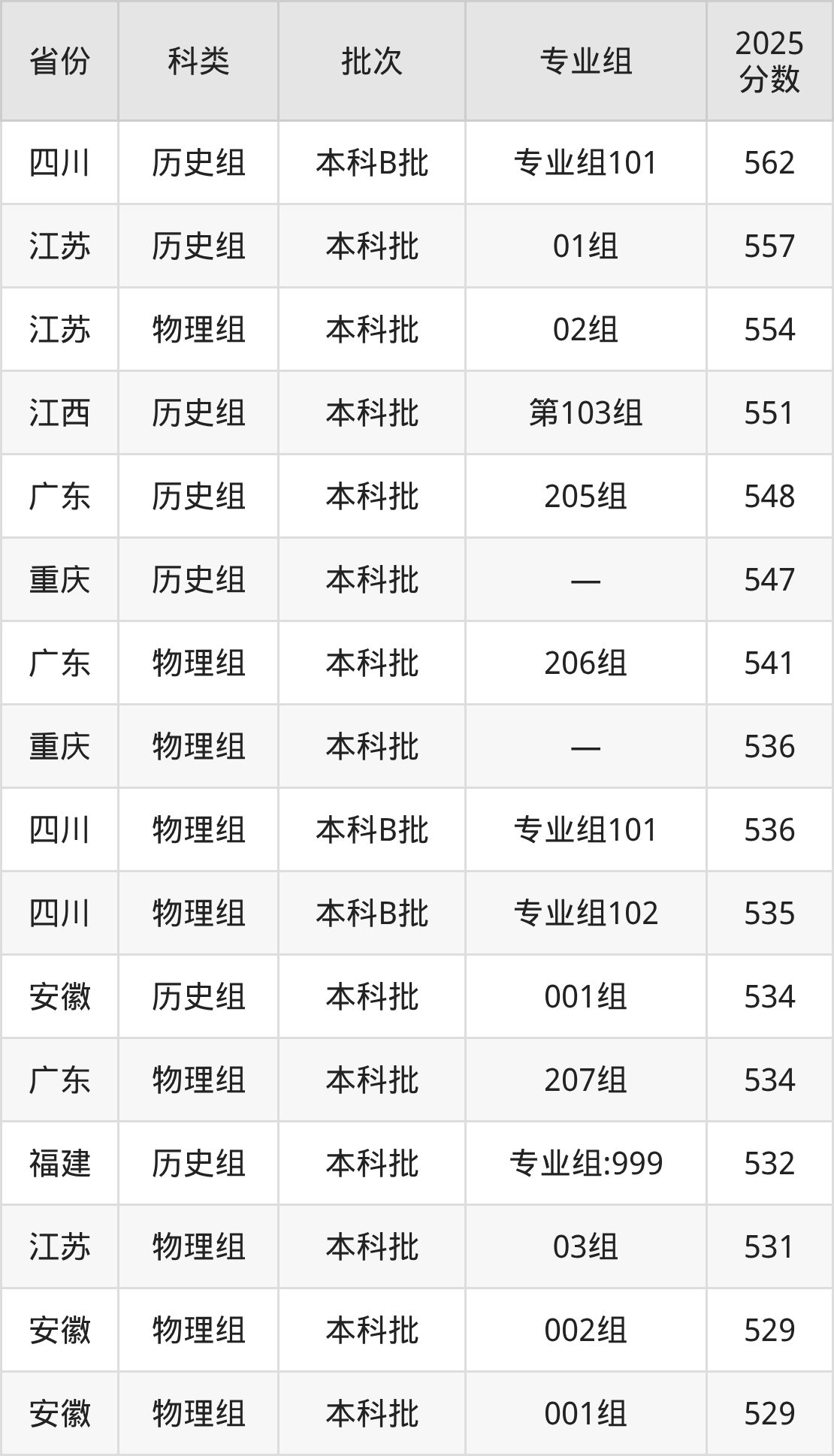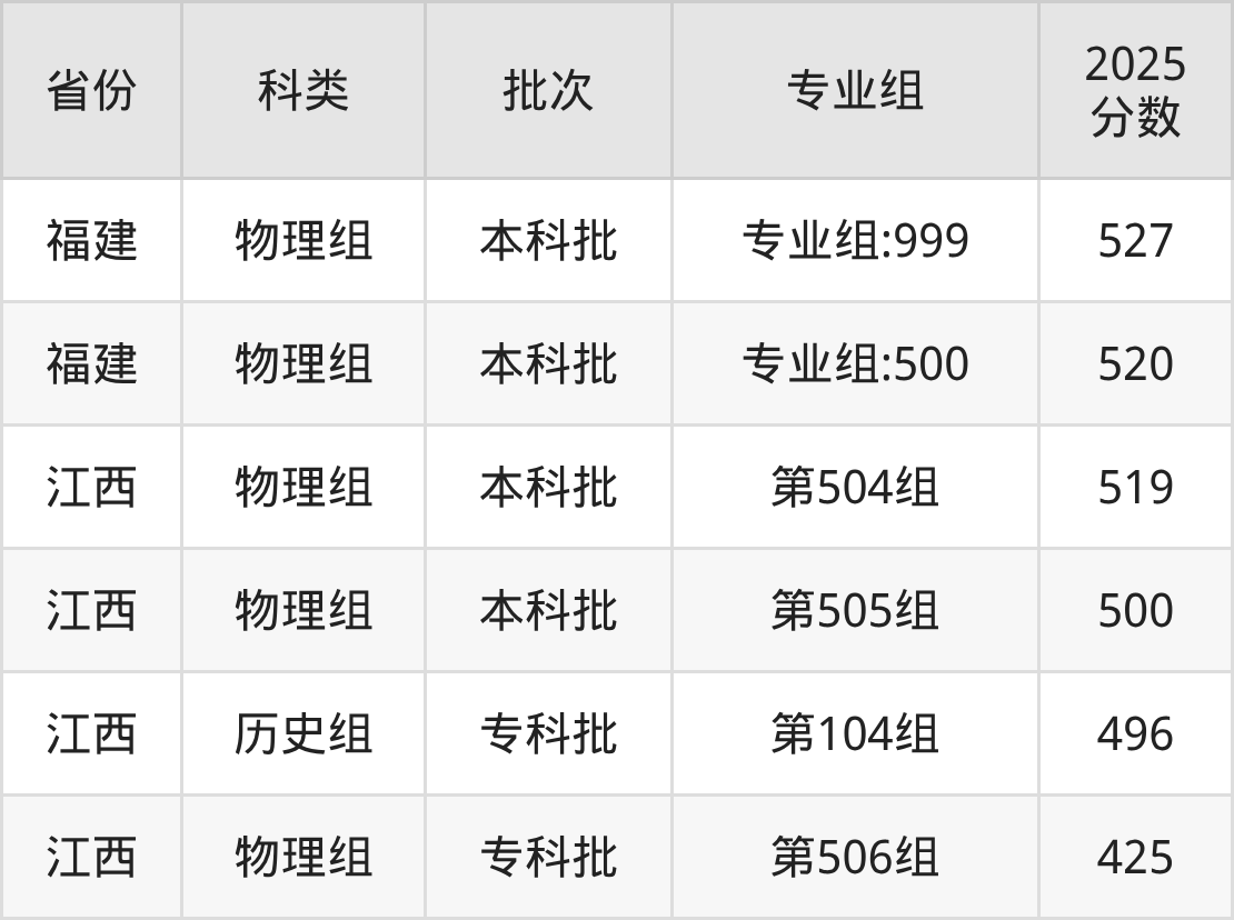 2025年江西警察学院在全国普通批次招生的录取分数范围位于425~562分之间,其中省内分数范围为425分~551分,历史组最低分专业组为“第104组”,考生496分即可报考,物理组最低分专业组为“第506组”,考生425分即可报考。