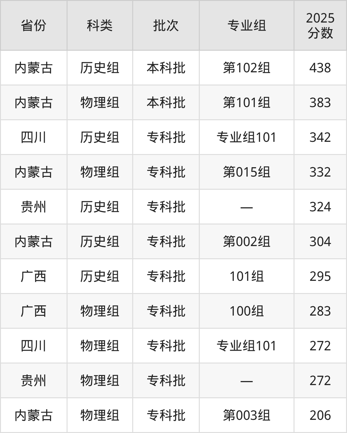 而四川地区历史组考生的分数门槛最高,2025年内蒙古建筑职业技术大学专业组101在四川招生最低分为342分,考生至少要超专科线192分才有可能被录取。