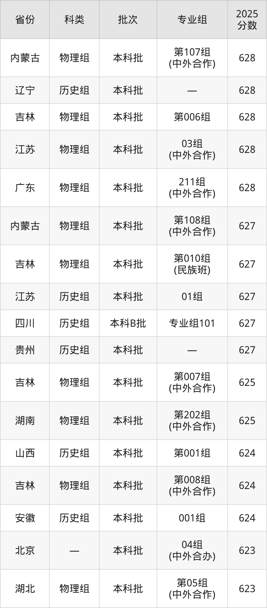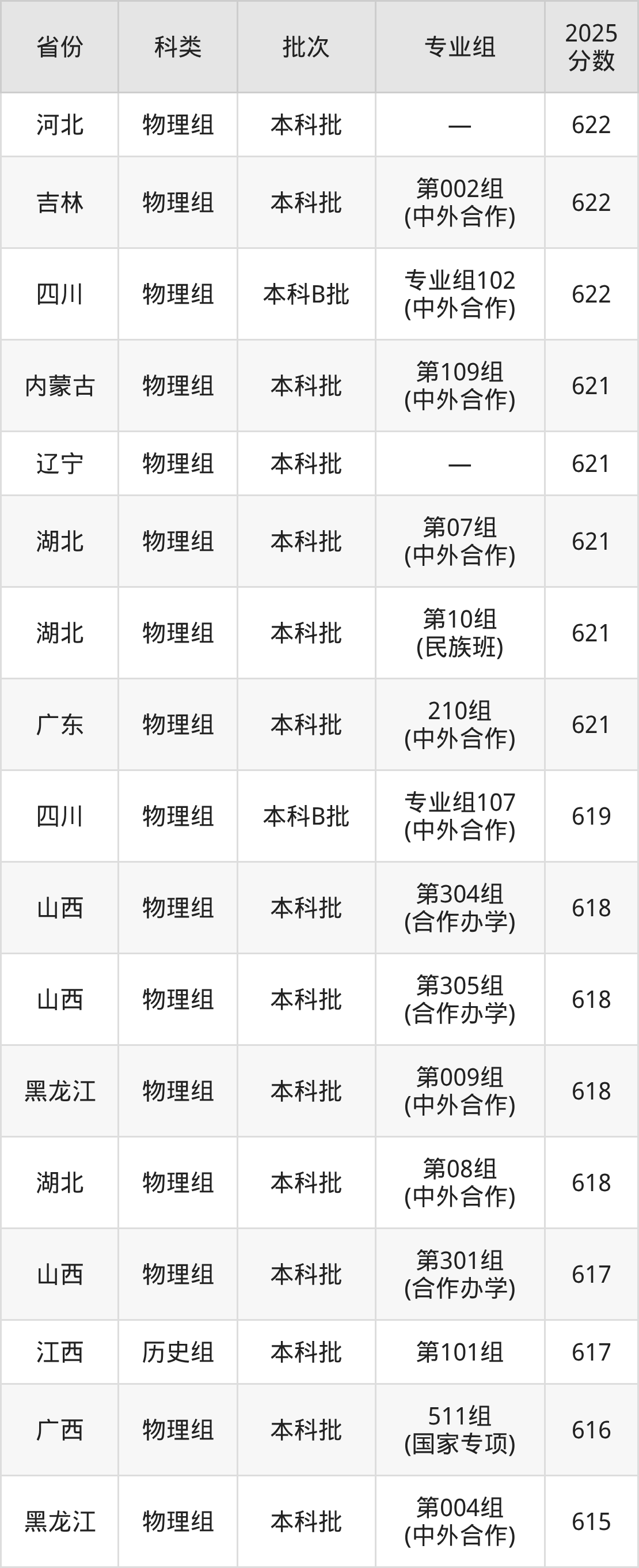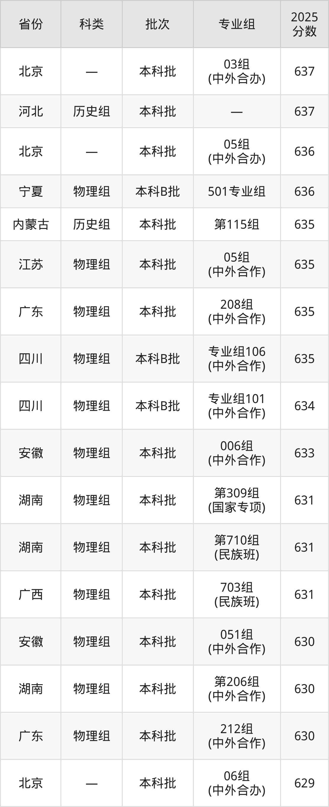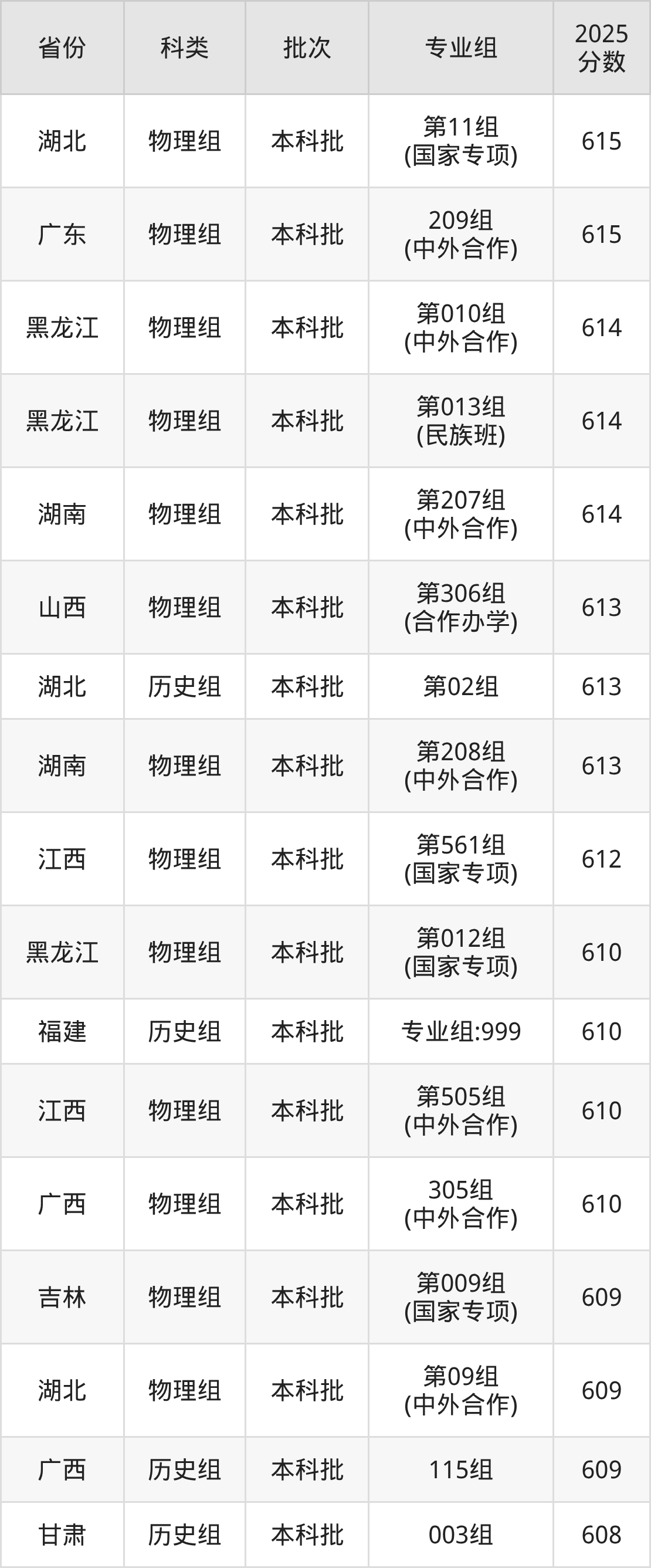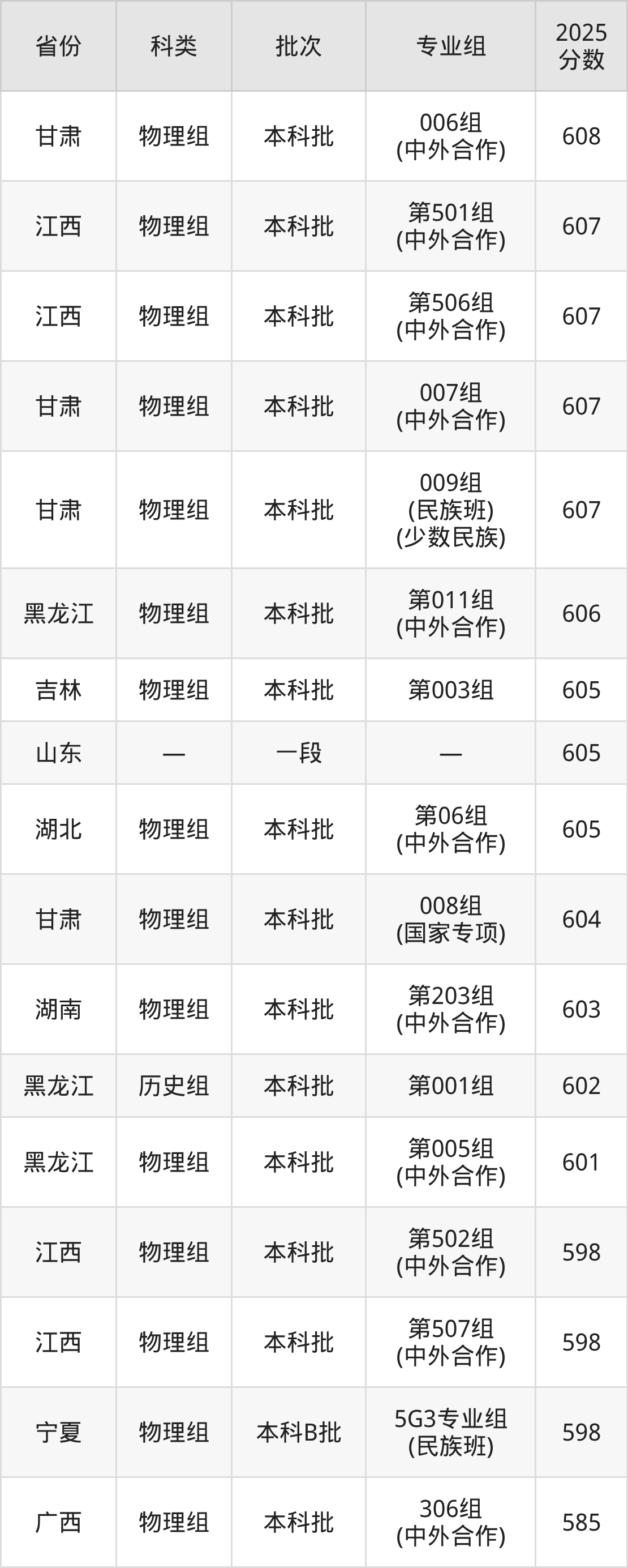 2025年哈尔滨工业大学在全国普通批次招生的录取分数范围位于552~787分之间,其中省内分数范围为601分~684分,物理组最低分专业组为“第005组(中外合作)”,考生601分即可报考,历史组最低分专业组为“第001组”,考生602分即可报考。